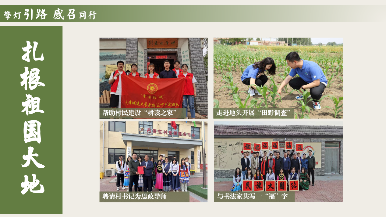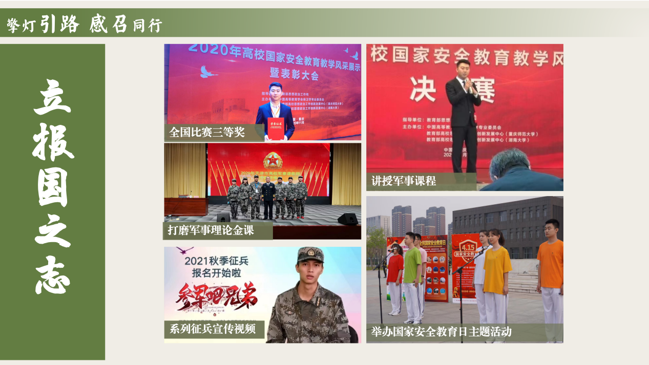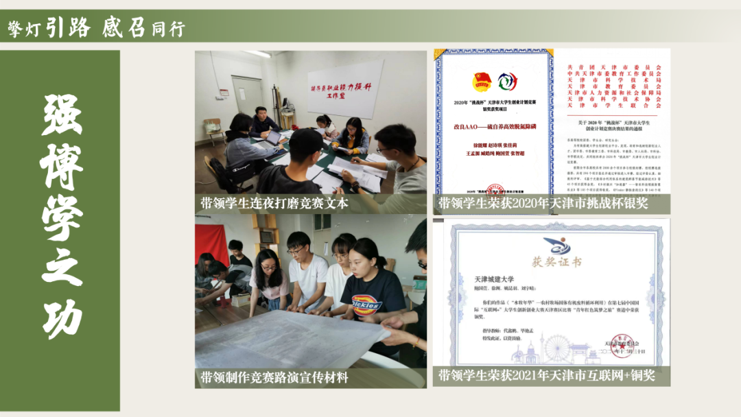 他以课堂为阵地,不断打磨出当代大学生喜爱的军事理论课程,实现学校辅导员国家级课程比赛获奖零的突破,引导学生成为挥洒热血青春,满怀报国之志的人。连续两年指导学生参加创新创业大赛获得天津市银奖、铜奖,引导学生成为追求卓越、做知行合一、求真务实之人。连续三年,累计带领65名学生深入村镇,开展田野调查,引导学生成为向群众学习,扎根基层建功立业的人。