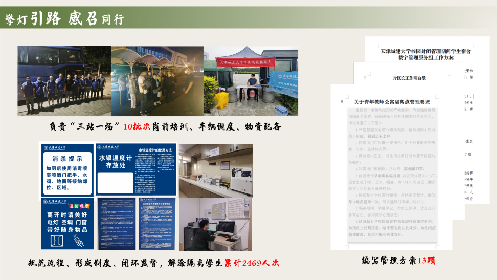 2022年疫情防控中,他先后负责10个批次的“三站一场”接站工作,和“城建蓝”一起披星而出,戴月而归,给学生及家长满满的安全感。负责第二隔离点和健康驿站的建设与运营,先后制定实施方案13项,累计接收解除学生2469人次,不让一个隐患进校园,用严密的制度、规范的流程,为学生筑起一道安全的防护墙。