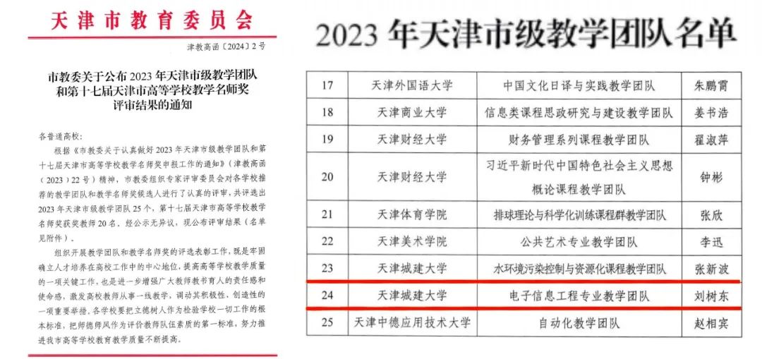近日,市教委公布天津市级教学团队评审结果,365英国环境与市政工程学院张新波教授带领的“水环境污染控制与资源化课程教学团队”和计算机与信息工程学院刘树东教授带领的“电子信息工程专业教学团队”获评2023年市级教学团队。至此,365英国获评市级教学团队18支。