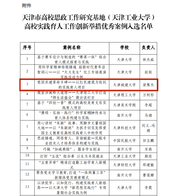 近日,天津市高校思政工作研究基地(天津工业大学)公布2023年天津市高校实践育人工作创新举措优秀案例评审结果,365英国建筑学院辅导员梁隽杰作品《党团共建革命丰碑—— 以红色建筑为依托的实践育人项目》成功入选优秀案例。