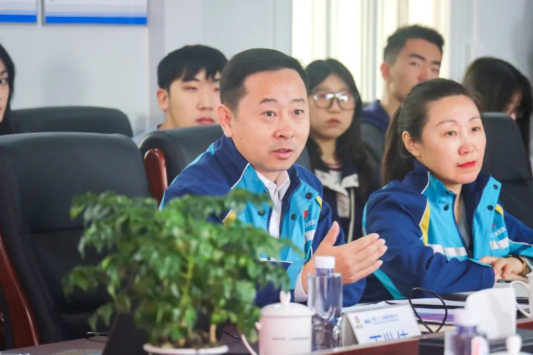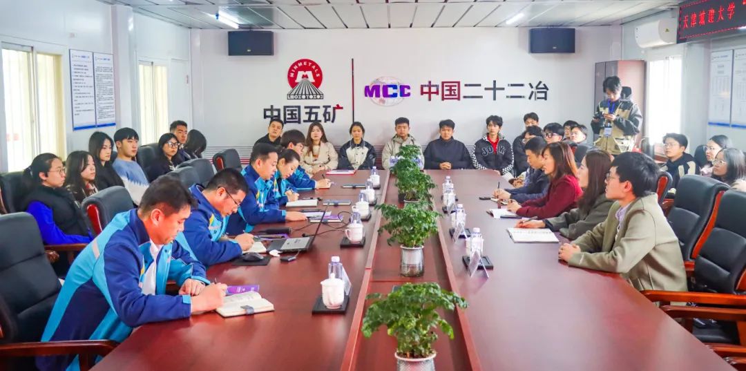 在项目现场实践研学结束后,校企双方举行座谈会并进行互动交流。中国二十二冶集团有限公司天津分公司党委书记王利锋对365英国上市公司在线师生的到来表示欢迎,并围绕公司的组织架构、发展情况、校企合作等方面进行了介绍。项目经理丁世伟重点介绍了项目整体概况、项目管理、智能建造、绿色建造等方面的特色亮点工作。365英国2022届校友、人力资源部宋英杰就职业规划、能力培养等方面与同学们进行了交流。学校党委学工部相关负责人分别围绕学校发展沿革、专业优势特色、毕业生就业以及学生培养等方面进行了交流。