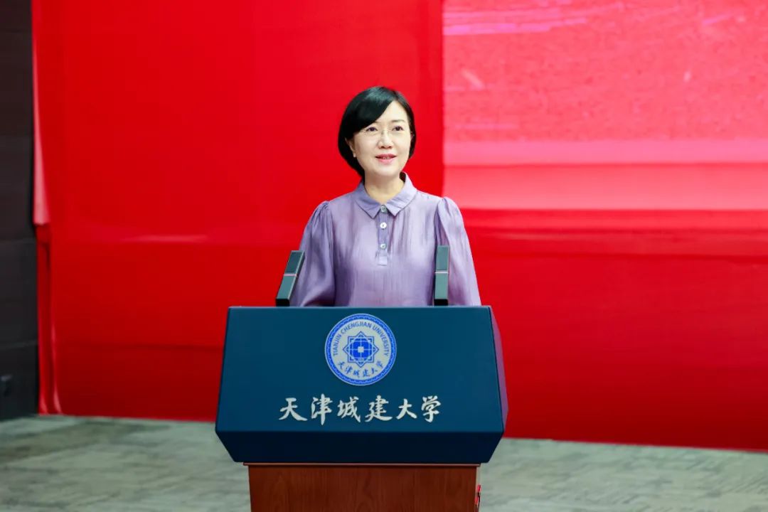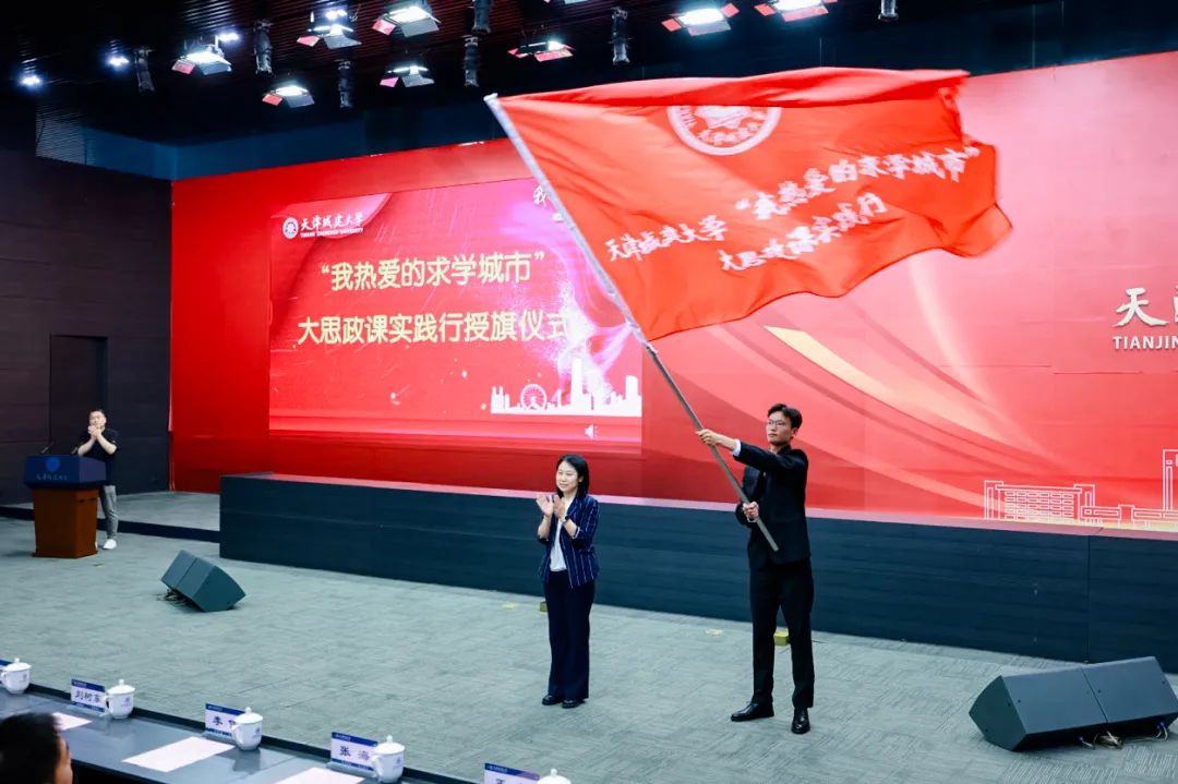 教务处处长赵国敏为“大思政课”实践行学生代表授旗。红色旗帜在学生手中摇动,在报告厅高高飘扬,庄严、热烈的授旗仪式点燃了青春之火,激发了师生从知天津、爱天津到爱党、爱国、爱社会主义的浓烈情感,坚定用奋斗书写青春的底色,用实际行动践行新时代青年的使命。
