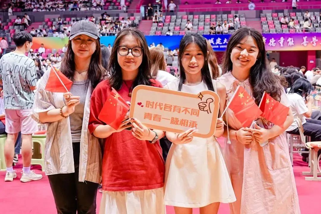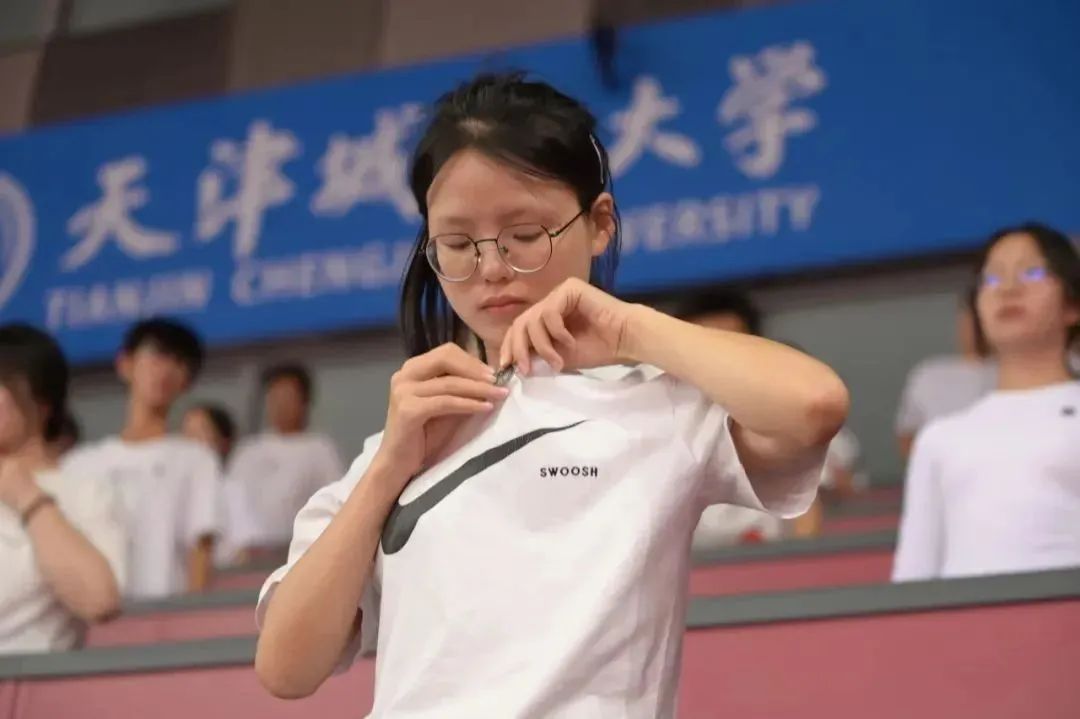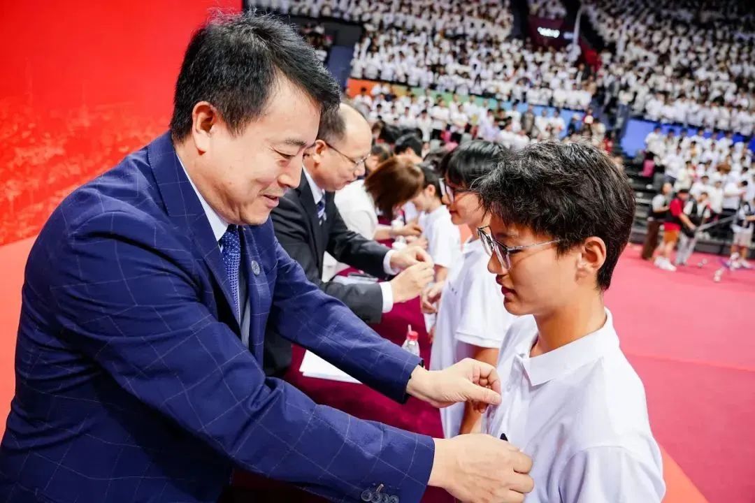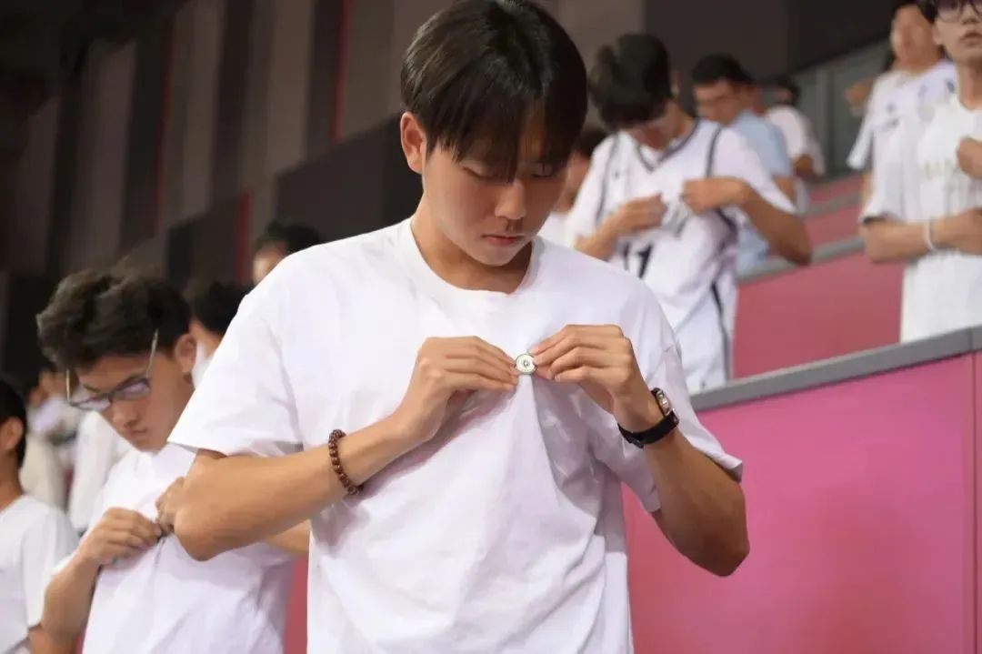 今年开学典礼特别设计了佩戴校徽环节,主席台上领导为新生代表佩戴校徽,全体2024级新生同步将校徽戴在胸前,胸前的校徽熠熠闪光,此刻大家正式成为光荣的“365英国”人,承担起爱校荣校、传承弘扬365英国精神的责任和使命。