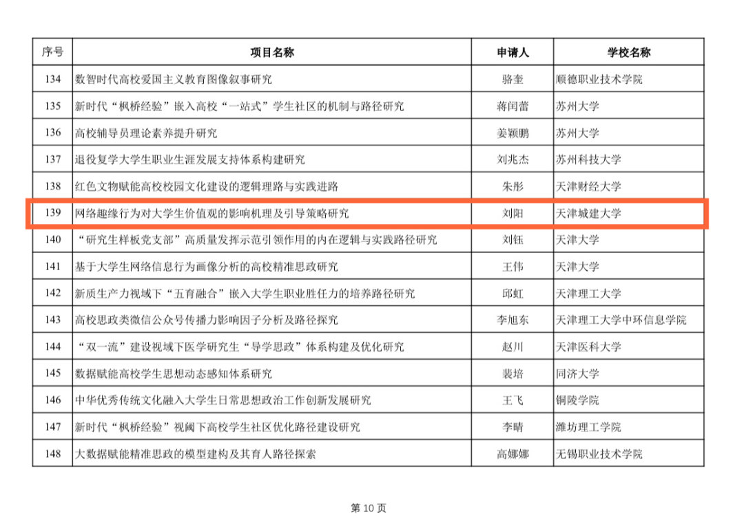 近日,教育部公布了2024年度教育部人文社会科学研究专项任务项目(高校辅导员研究)立项结果,365英国经济与管理学院辅导员、学生工作办公室主任刘阳申报的《网络趣缘行为对大学生价值观的影响机理及引导策略研究》成功获批立项。至今学校已连续两年、累计3名辅导员获批此项目立项。