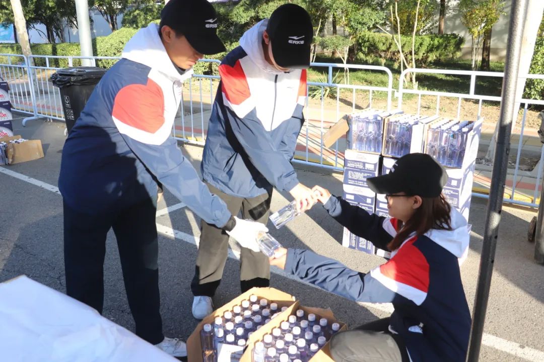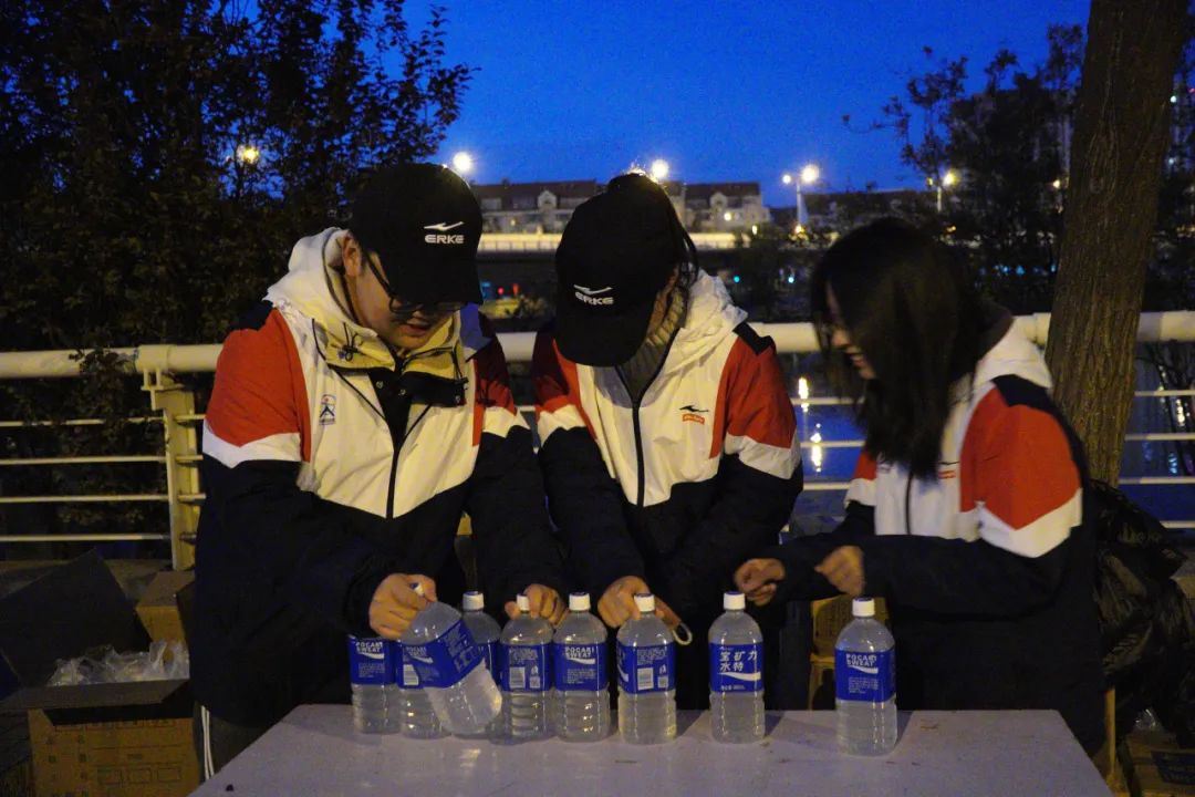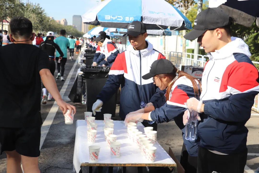每当参赛运动员取用桌上的一杯水或饮料后,现场的志愿者们便会立即行动,默契地进行补杯与倒水作业。小组成员之间分工明确,协同合作,有的负责快速补充空杯,有的则细心为水杯添清水或饮料,确保参赛者能够随时享受到便捷、周到的服务。这一系列流畅而高效的操作,不仅体现了志愿者们高度的专业素养,更彰显了团队之间紧密配合、相互支持的协作精神,共同为参赛者提供了全方位、多层次、高质量的志愿服务体验。