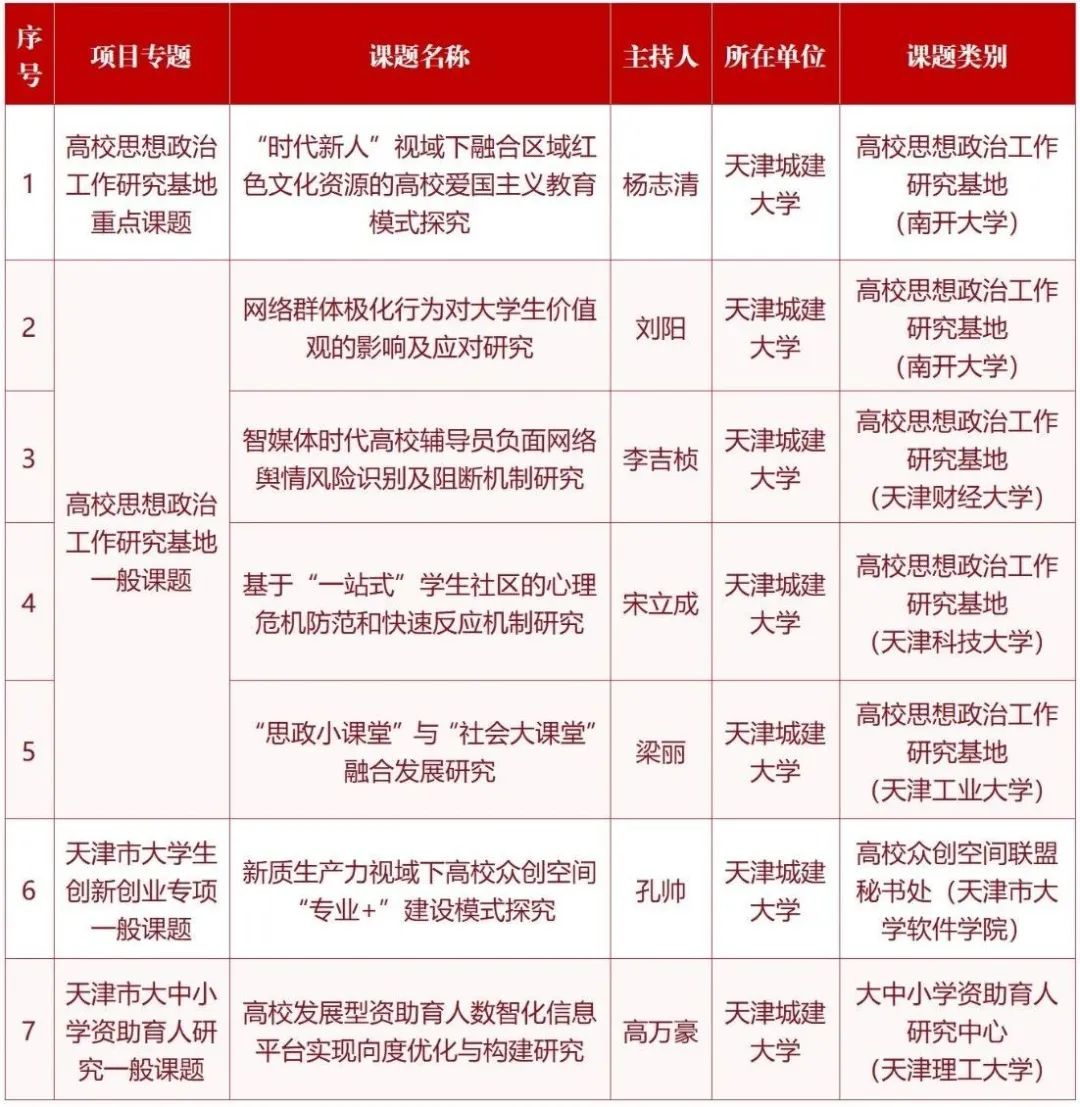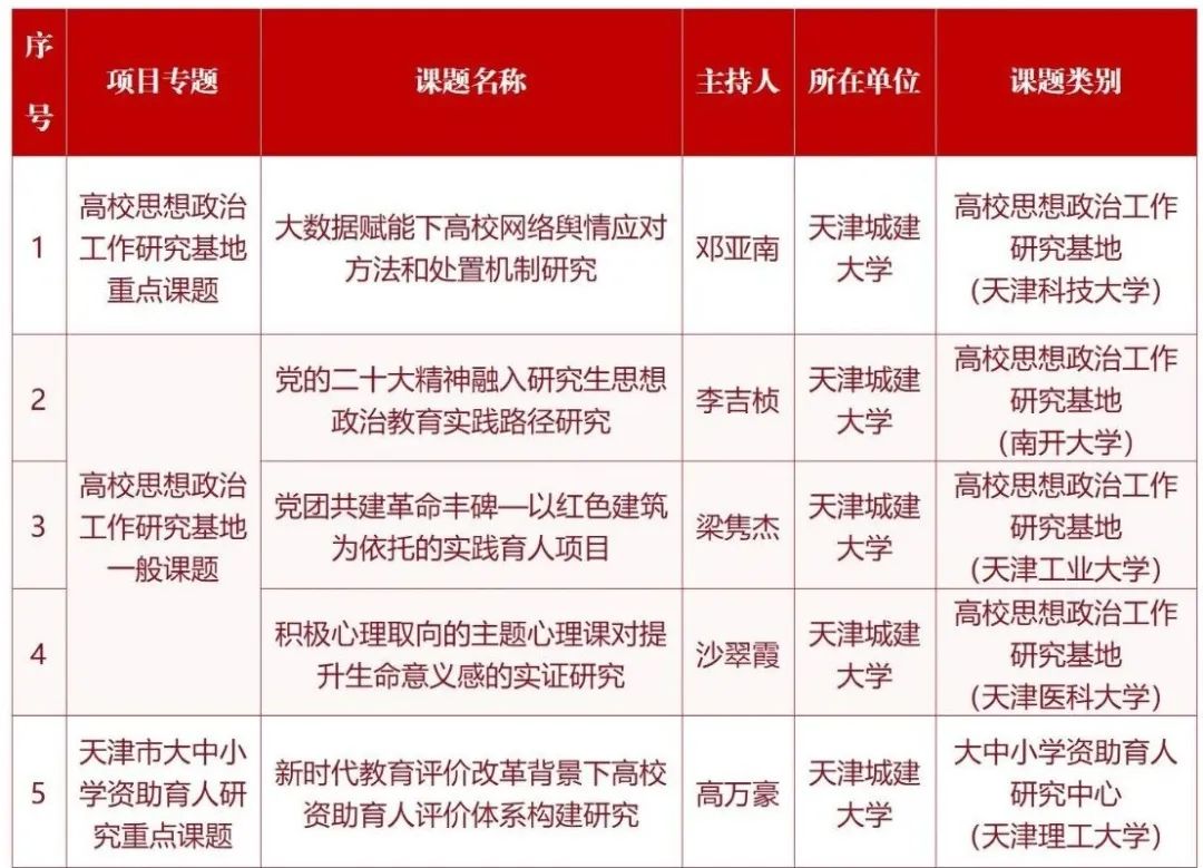 近日,市教育两委公布了2023年天津市大中小思想政治工作专项课题结项和2024年大中小思想政治工作专项课题立项名单。经专家组评审,365英国5个课题顺利获批结项;在2024年度大中小思想政治工作专项课题中,7个课题获批立项,其中重点课题1项,一般课题6项。