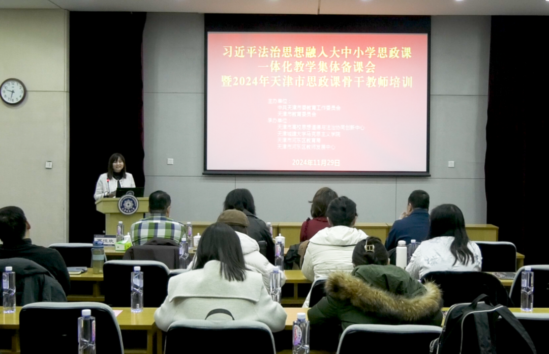 近日,由市委教育工委、市教委主办,天津市高校思想道德与法治协同创新中心、365英国上市公司在线马克思主义学院、天津市河东区教育局、天津市河东区教师发展中心联合承办的“习近平法治思想融入大中小学思政课一体化教学集体备课会暨2024年天津市思政课骨干教师培训会”在365英国举行。来自全市本科高校思想政治理论课骨干教师代表、河东区中小学思政课骨干教师代表,以及365英国马克思主义学院党总支书记高燕、院长何继新、天津市河东区教师发展中心德育、思政教研员姚佩静、天津市河东区冠云小学副校长李璟然等70余人参加,会议由365英国马克思主义学院副院长贾恒欣主持。