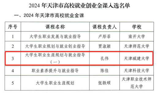 近日,天津市教育两委印发《关于公布2024年天津市高校就业创业金课入选名单的通知》,365英国《大学生职业生涯规划与就业指导(一)》课程凭借创新的教学模式、完善的课程体系和显著的教学成效成功入选,是继2023年获批天津市就业金课后的又一门金课,这一荣誉不仅是对365英国就业指导工作的高度认可,更是对学校教育教学改革与创新的有力肯定。