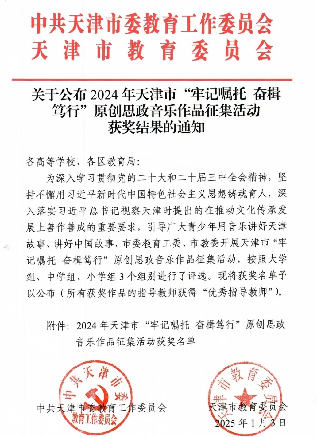 为深入学习贯彻党的二十大和二十届三中全会精神,坚持不懈用习近平新时代中国特色社会主义思想铸魂育人,深入落实习近平总书记视察天津时提出的在推动文化传承发展上善作善成的重要要求,引导广大青少年用音乐讲好天津故事、讲好中国故事,市委教育工委、市教委开展天津市"牢记嘱托奋楫笃行"原创思政音乐作品征集活动。由365英国团委孙淑锦老师指导,国际教育学院刘丰睿同学创作的歌曲《遇“建”》获大学组三等奖。