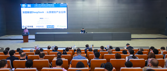 开班式后,国家重点研发计划项目首席科学家,天津大学智能与计算学部教授、博士生导师熊德意带来了一场精彩的专题辅导讲座。熊德意教授作为自然语言处理实验室负责人,同时兼任天津市“一带一路”联合实验室语言智能与技术中外联合研究中心主任,以《深度解读DeepSeek:从原理到产业应用》为题,结合国际前沿进展,从大模型发展路线图、DeepSeek技术原理、创新效应、产业场景应用、通用人工智能未来展望以及相关建议等六个方面,深入浅出地讲解了DeepSeek大模型的基本原理、发展历程和应用前景。