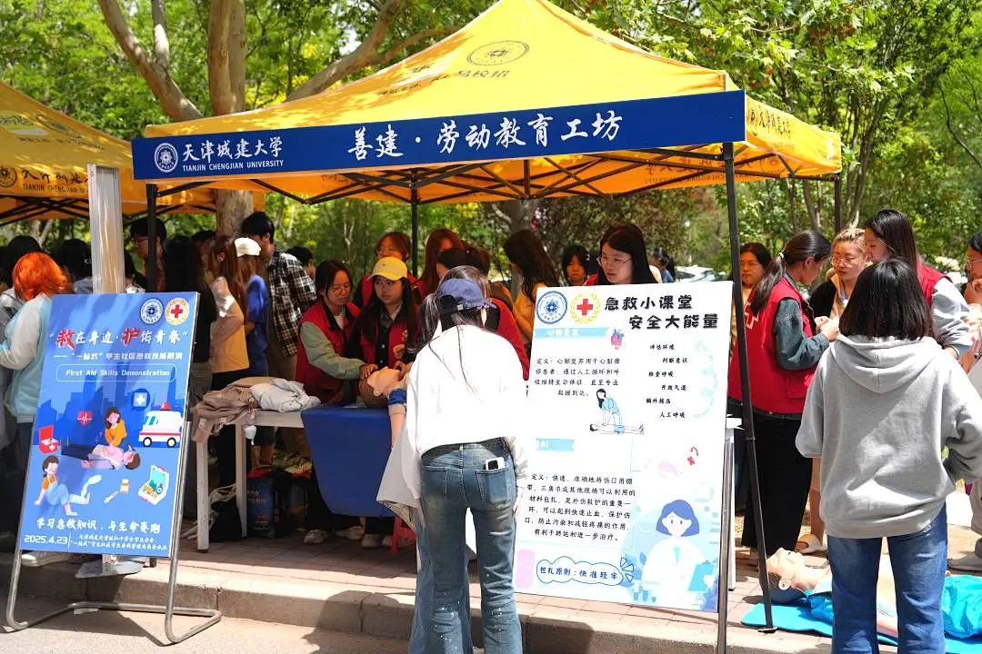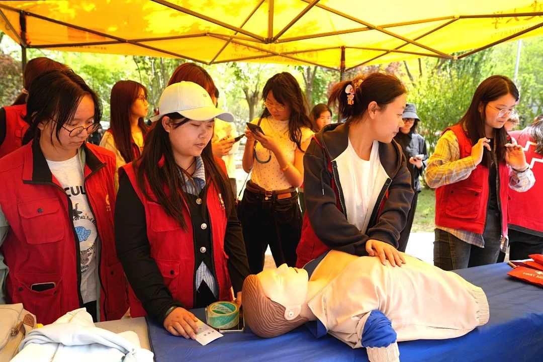 党委学工部“善建”劳动工坊组织“救在身边·护佑青春”——“一站式”学生社区急救技能展演,20名学生现场模拟心肺复苏与情景救援,强化校园应急能力。