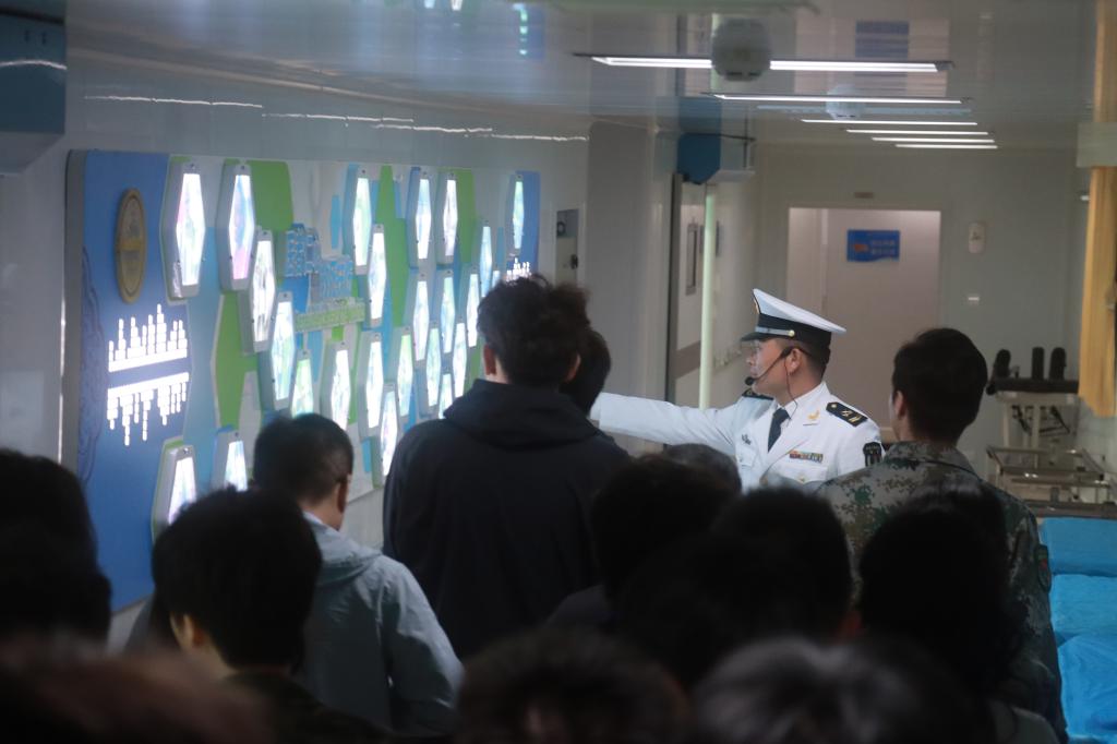 活动现场,师生怀揣着崇敬与期待的心情,整齐有序地登上“和平方舟”号医院船。甲板上,船员们热情讲解这艘“生命之舟”曾多次走出国门,奔赴世界各地执行医疗服务、人道主义救援等任务的荣耀历程。船舱内,珍贵的任务照片、各国赠送的纪念物,生动展现了“和平方舟”救死扶伤、传递和平的动人故事。师生们在触摸大国重器中厚植家国情怀,增强了民族自豪感和国家安全意识。