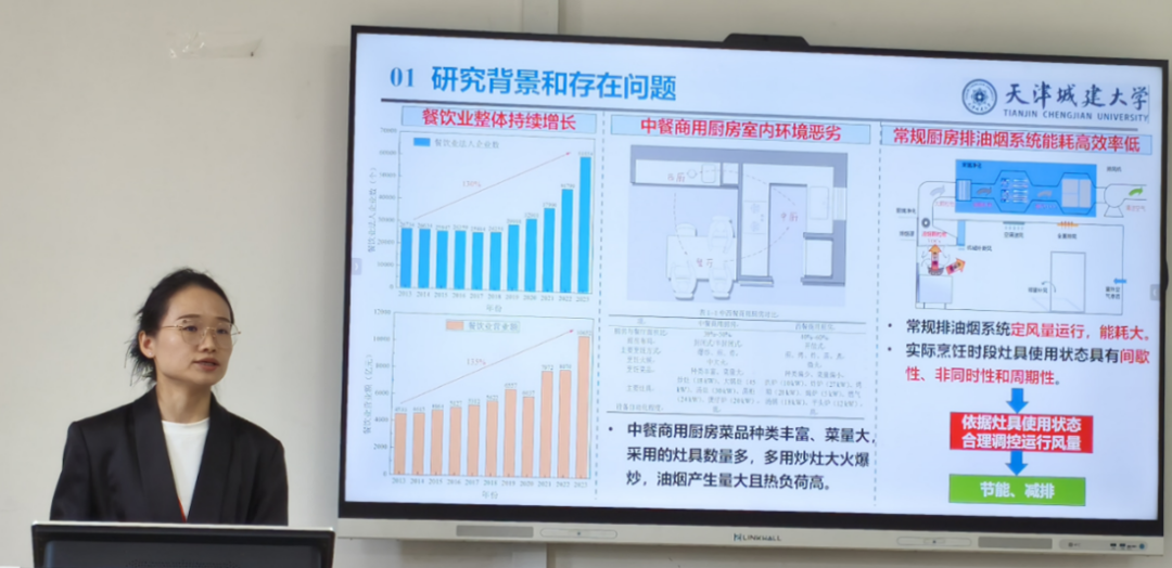 张啊文老师在“供热、空调系统控制仿真与应用”分论坛中作了题为《中餐商用厨房排风量按需控制研究》的专题报告,针对常规商用厨房集中式排油烟系统存在的问题,结合案例厨房实际运行期间不同时刻灶具使用情况,介绍了依据锅面和罩内吸风口处环境参数进行风量按需控制的方法。