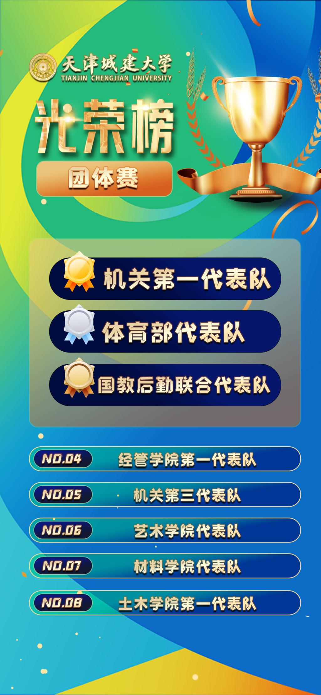 经过为期八天的紧张激烈角逐,团体赛中,机关第一代表队蝉联冠军,体育部代表队获得亚军,国教后勤联合代表队获得季军。经管学院第一代表队、机关第三代表队、艺术学院代表队、材料学院代表队、土木学院第一代表队依次位列4至8名。