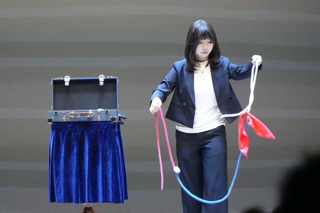 《绳舞结韵》以舞台绳索魔术的长短变化、数量增减以及不同颜色的绳索彼此之间纠缠交叉、分开又相连,超高难度的技巧让观众叹为观止;《侠客行》将中国扇文化与舞台魔术结合,扇面开合间暗藏玄机,古典意象与奇幻效果相得益彰;《银币幻境》展现经典硬币魔术,金属光泽在虚实空间中穿梭,塑造水中花、镜中月一般的优美感;《花漾浮影》则以花鸟为灵感,魔术师在指尖绽放的鲜花和七彩的泡沫,又使和平鸽翩跹书本间演绎了生命的奇幻诗篇。