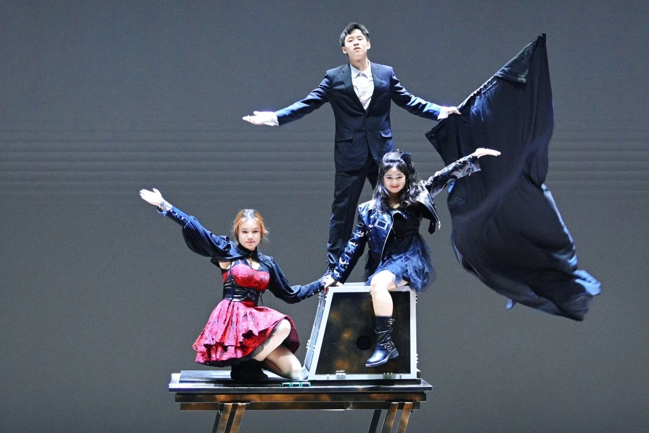 演出以主持人的指尖魔术拉开序幕,舞台化作光影交织的奇幻世界。大型魔术《大变活人》以惊险刺激的瞬间将观众带入魔术之旅,魔术师在密闭空间内瞬间换位在观众意想不到的位置突然出现,引得全场欢呼;《井字游戏》将经典棋盘博弈转化为悬念迭起的互动魔术,观众随机选择的棋子与数字却难逃魔术师“预判”,智慧与幻术的碰撞点燃现场热情;《圆环之理》中,银环在魔术师指间穿梭、悬浮、链接、分离,以极简道具和清新的配色演绎宇宙法则般的哲学美感;《伞耀奇迹》则以雨伞为主要表演元素,在魔术师的手中翻飞起舞,凭空在手中出现惊人数量的雨伞,令人瞠目结舌。