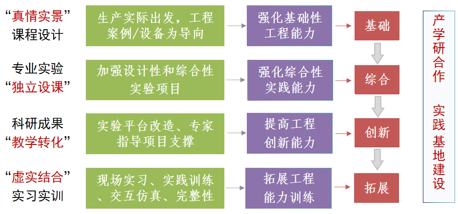 学院积极探索实践教学新模式,构建了"基础实验-工程实训-创新工坊"三级实践教学体系,开设金工实习、生产实习、毕业实习、创新训练四位一体的实践教学环节。通过校企共建和学科建设双重驱动,建设了多个特色实训工坊和50多个特色校外实习基地,为应用型工程人才培养创造有利的实践教学环境。通过增设综合性、创新性实践项目,调动学生们从事科学研究及工程实践的积极性,促使同学积极参加各项学科竞赛、创新创业训练、科研课题,训练基本技能,锻炼工程思维,提高工程素养。2024届毕业生实践能力获用人单位好评,就业率超90%。