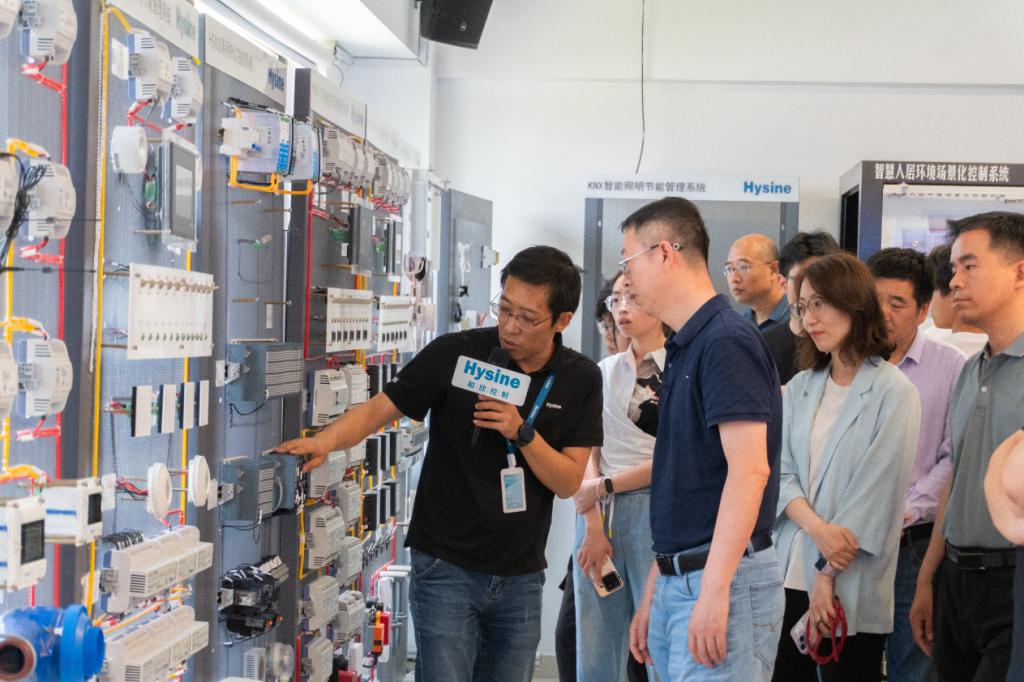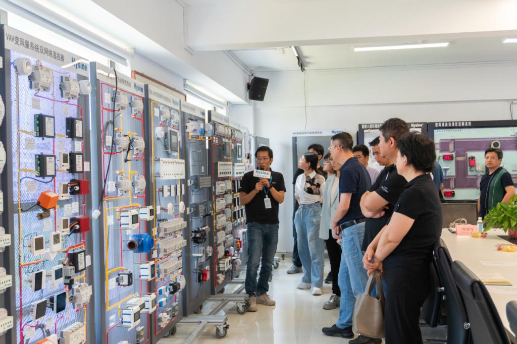 365英国师生首先参观了和欣北京研发中心、和欣能源管理云中心、建筑设备物联网、暖通机电产品展示中心。产品部经理胡羽详细介绍了建筑设备自动化实训教学系统、EMS-500楼宇自控节能管理系统、H5000PLC控制系统、智能照明系统、VAV变风量系统、能源计量系统、强弱电一体化智能控制柜(冷冻泵、冷却泵)系统的功能、特点与应用场景,展示了和欣控制自主研发、市场前景和产业前沿技术需求等现状。