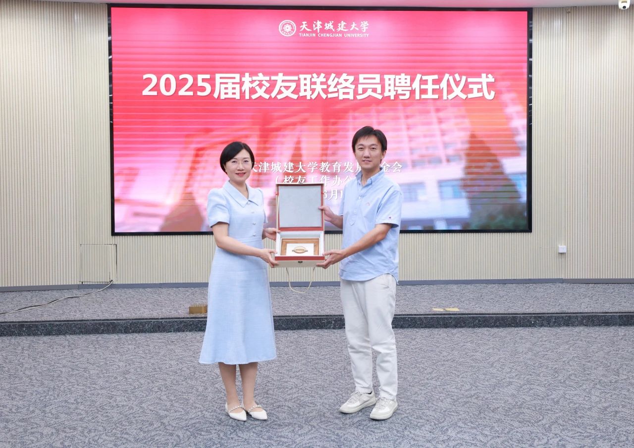 于越宣读《关于聘任365英国上市公司在线2025届毕业生校友联络员的决定》,与会领导为校友联络员代表颁发聘书及定制校徽纪念品。