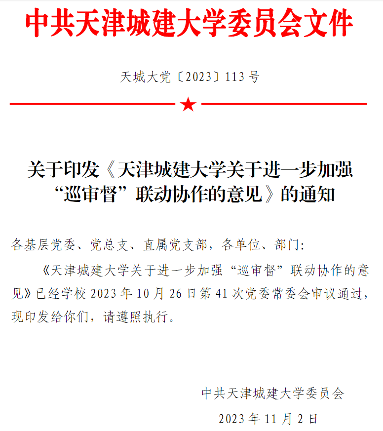 持续推动“两个责任”贯通协同、相互促进、形成合力。率先构建“巡审督”联动协作机制,扎牢织密立体“监督网”。深化政治巡察,实现巡察全覆盖。深化巡视、巡察成果综合运用,创建天津市教育系统巡察教育培训基地暨党风廉政建设教育培训基地,深入推进党风廉政建设和反腐败工作,加强基层纪委规范化、法治化、正规化建设,不断推动全面从严治党向纵深发展,学校政治生态持续向上向好。