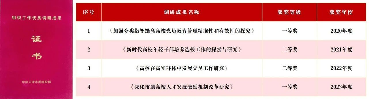 深入实施党支部标准化规范化建设专项行动,党支部总数由154个增加到172个,发展党员2874名,党的组织体系建设效能整体提升。构建“党建双创”三级培育体系,推进党建与业务深度融合,获批2个“全国党建工作样板支部”和1个全国高校“双带头人”教师党支部书记“强国行”专项行动团队。党组织和党员作用发挥进一步彰显,2个党组织、5名党员受到天津市和教育系统“两优一先”表彰。组织工作调研成果获市级一等奖2项,二等奖2项。