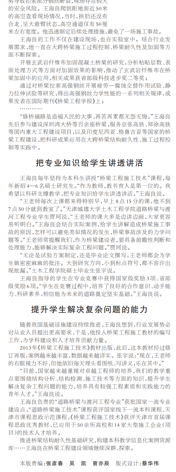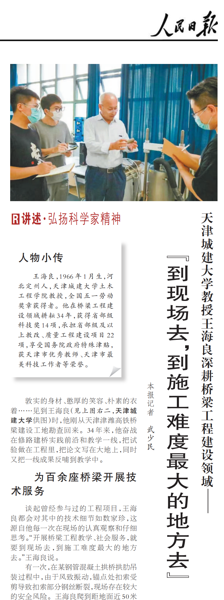 王海良教授获评全国五一劳动奖章《人民日报》刊登王海良教授深耕修路建桥实践前沿和教学一线的事迹