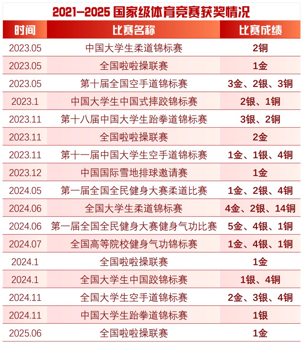以“打造国家级和市级体育品牌”为目标,以“空手道、健身气功(国家级)和排球、篮球、啦啦操(市级)特色项目”建设为抓手,巩固城大体育优势,全面提升学生体育竞赛成绩。五年来,共获国家级奖牌88枚,其中金牌23枚;获省部级奖牌161枚,其中金牌58枚。