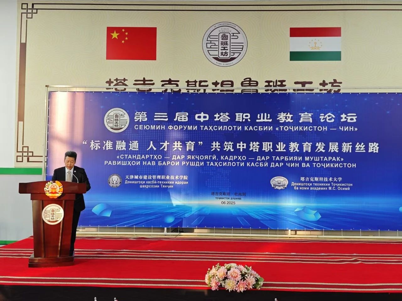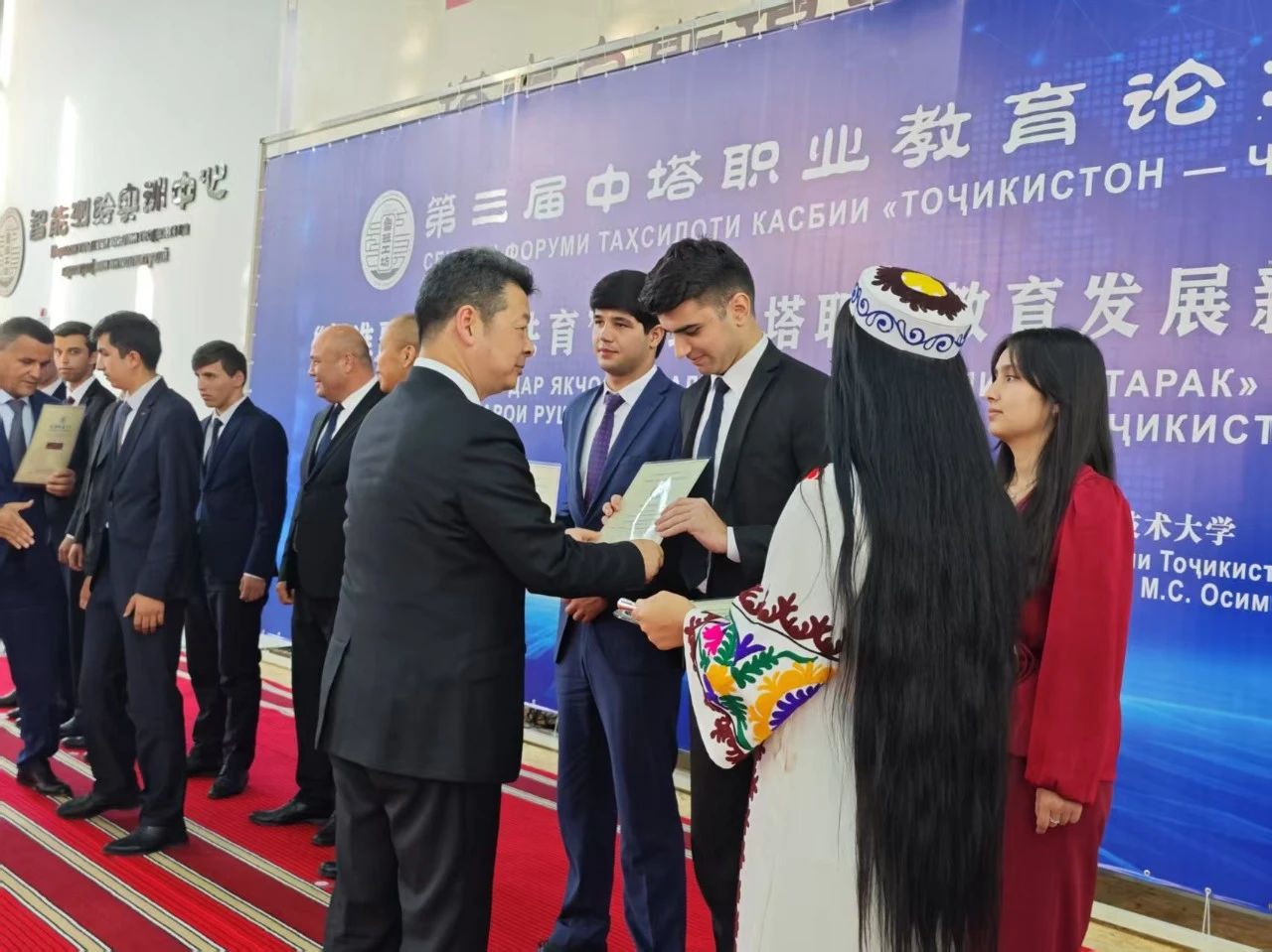 近日,校党委常委、副校长阎兵应邀率团访问塔吉克斯坦技术大学,与该校校长达夫拉特佐达举行会谈并参加第三届中塔职业教育论坛。中国驻塔吉克斯坦大使吉树民、塔吉克斯坦教育和科学部副部长穆扎法尔佐达、中国教育国际交流协会会长刘利民、副秘书长傅博、天津市委教育工委委员、市教委副主任罗延安、两国高校及企业代表等出席论坛。