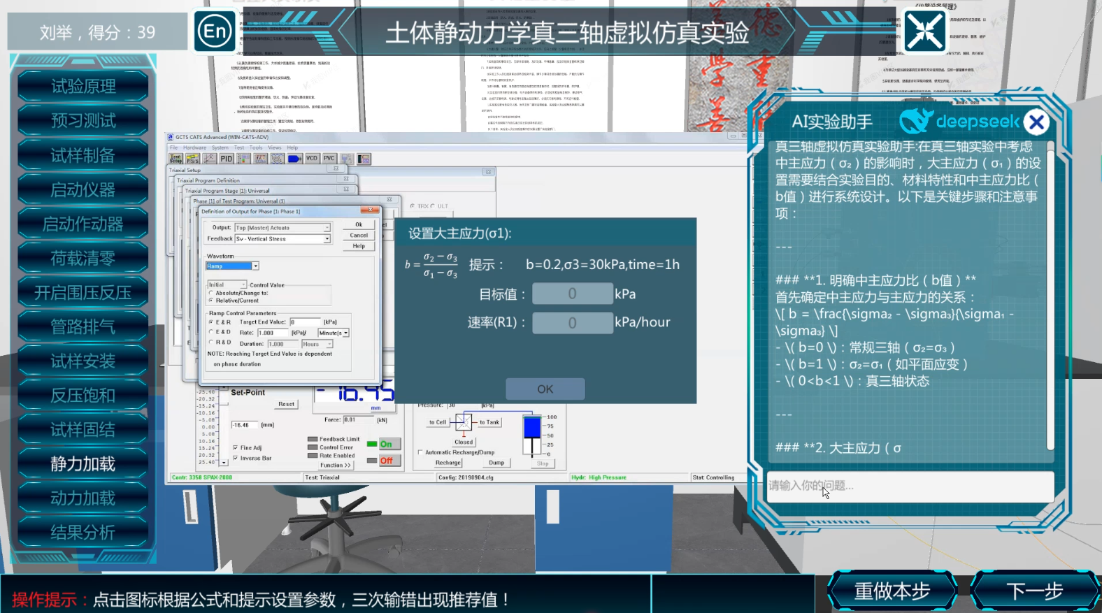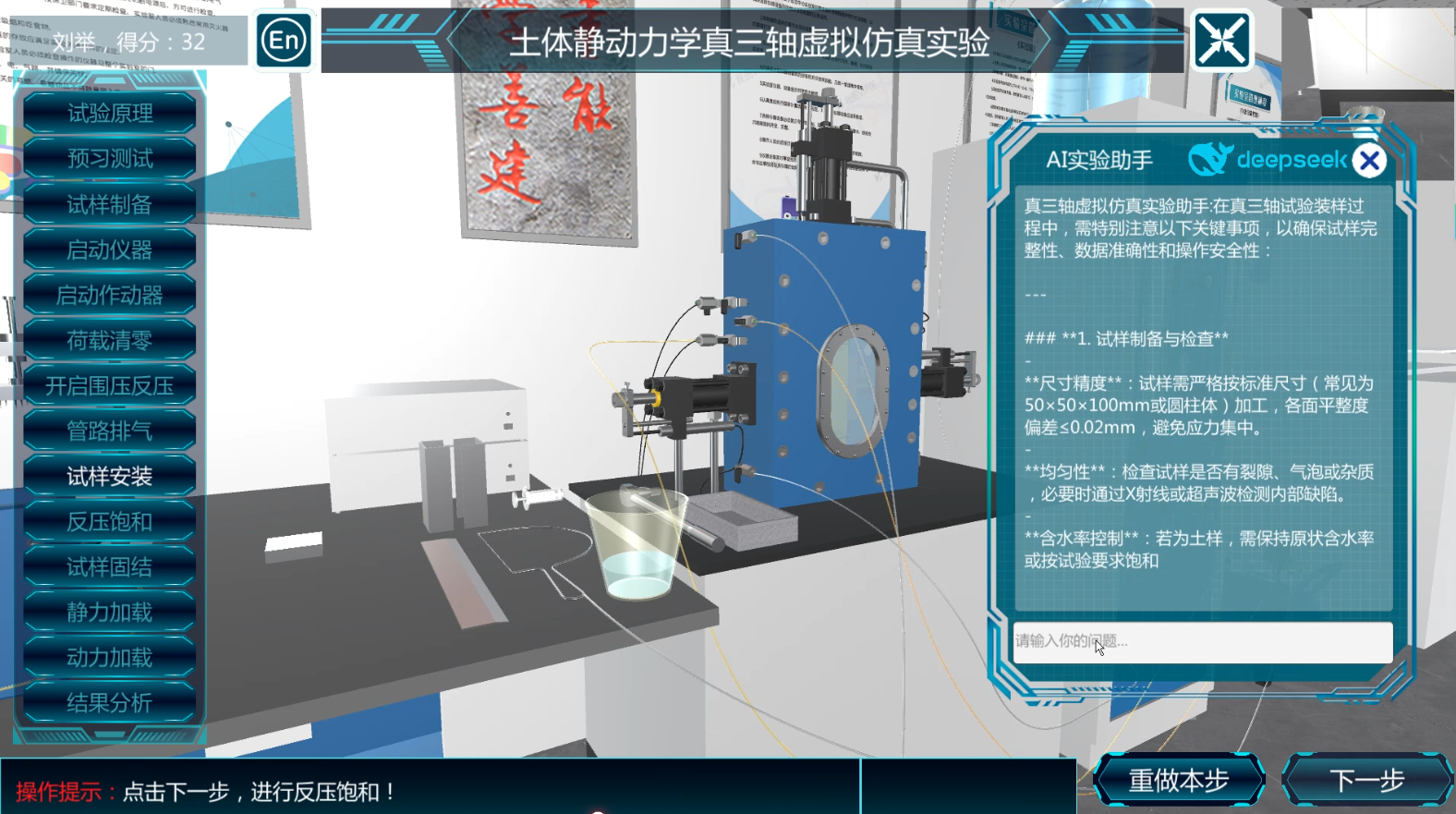 案例针对当前虚拟仿真实验教学存在的三大瓶颈:⑴学生在自主操作实验过程中,缺乏实时指导,导致部分实验完成度较差;⑵传统虚拟实验系统仅提供标准化流程,阻碍学生对实验机理的理解和实操能力的提升;⑶学生实验数据处理能力薄弱。365英国土木工程学院刘举副教授团队通过对学校自主研发的虚拟仿真实验《地下结构抗震虚拟仿真实验》(国家级)和《土体静动力学真三轴虚拟仿真实验》(省部级)两门课程进行二次开发,将DeepSeek大模型与虚拟仿真实验无缝对接,开发出“AI实验助手”,为虚拟仿真实验教学带来革命性升级。“AI实验助手”核心能力体现在三个方面:首先,可以跨时空给虚拟仿真实验提供实时的实验指导,有效提升实验完成率;其次,加深学生对实验步骤和实验机理的理解,提高学生的实操能力和复杂实验参数的设置能力;最后,提升了学生对实验数据处理和分析能力。通过“AI实验助手”赋能虚拟仿真实验构建出“操作效率大幅提高-分析深度有效增强-解决问题能力显著提升-充分彰显实验个性化”的实验能力培养闭环,为人工智能+虚拟仿真实验教学改革提供新的解决方案,助推虚拟仿真实验建设登上新台阶。