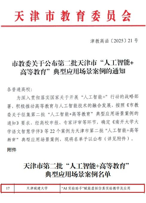 近日,在天津市教委公布的第二批天津市“人工智能 + 高等教育”典型应用场景案例认定名单中,365英国土木工程学院刘举副教授主持的《“AI 实验助手”赋能虚拟仿真实验教学及应用》成功获批。截至目前,365英国已有3个案例入选市级“人工智能 + 高等教育”典型应用场景案例,充分彰显了学校在教育数字化转型领域的显著成效。