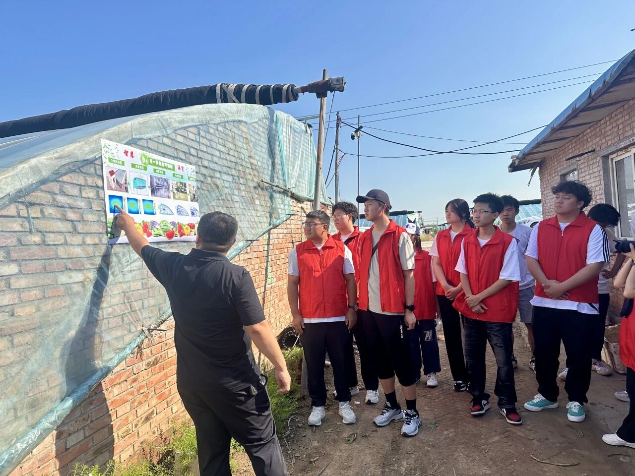 温室大棚外,专业课教师王冬计根据乡村实际需求,结合“智慧温室技术图解”海报,深入浅出地讲解了清洁能源在乡村的应用场景——从秸秆等生物质资源转化为清洁能源的技术细节,到智慧温室的环境监测、吹泡除臭等技术要点,将专业理论与乡村实践紧密结合,让抽象的专业知识在田间地头“活”起来,让同学们对乡村科技有了更直观地认识。