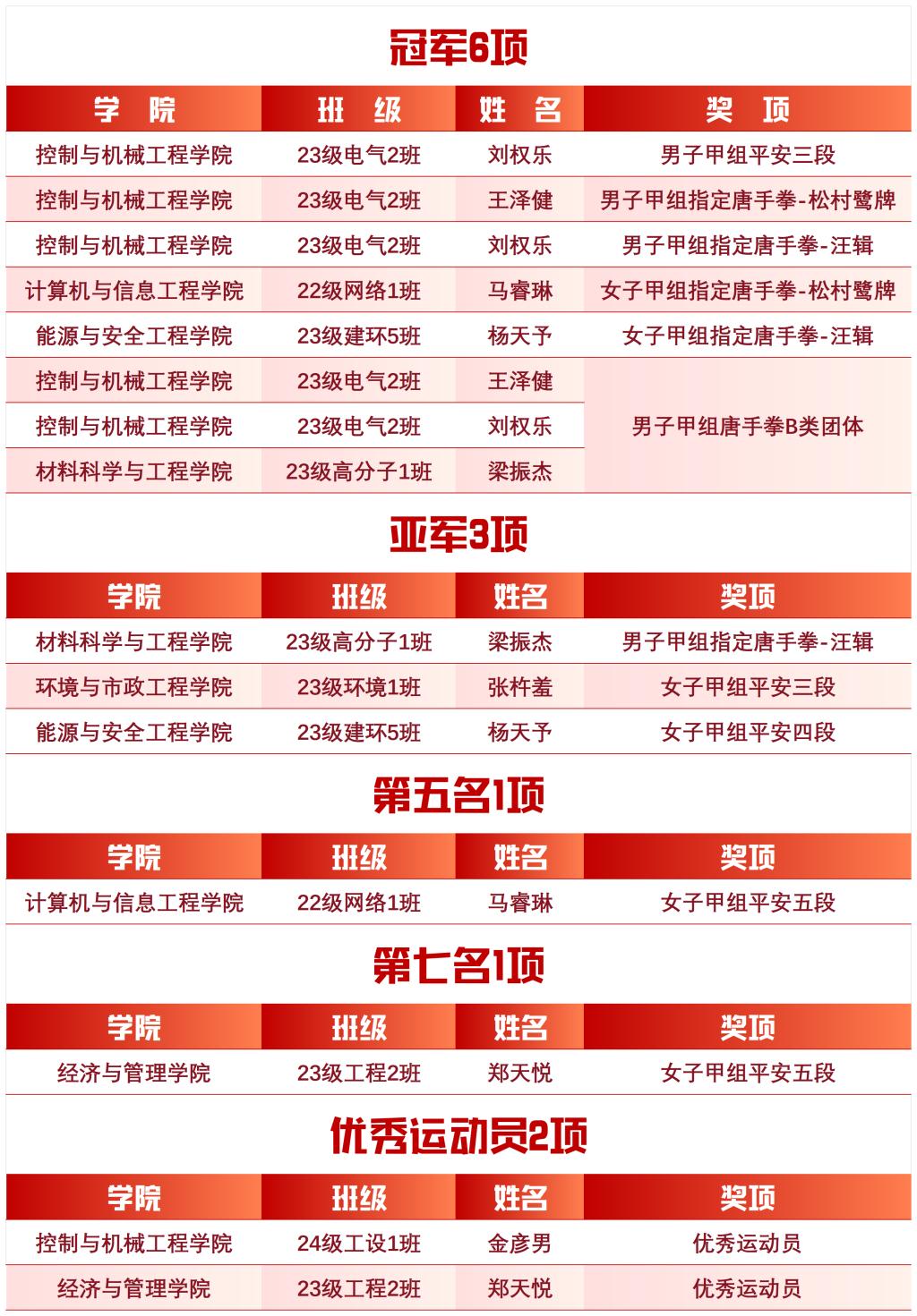 本次比赛,365英国共选派8名运动员参赛,在体育部刘丽老师和李正老师的悉心指导下,同学们不仅在招式技法上得到精进,更在尚武精神、坚韧品格的塑造上实现了提升。赛场上,他们完美诠释了“重德重能 善学善建”的校训精神,彰显了365英国推进新时代民族传统体育教育、深化体教融合的重要成果,展现了365英国上市公司在线学子刚健有为、昂扬向上的青春风采。