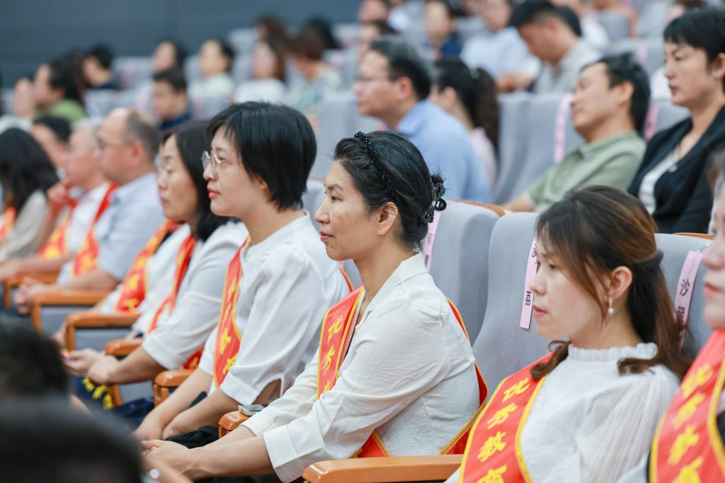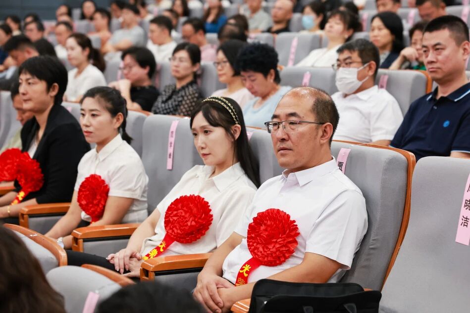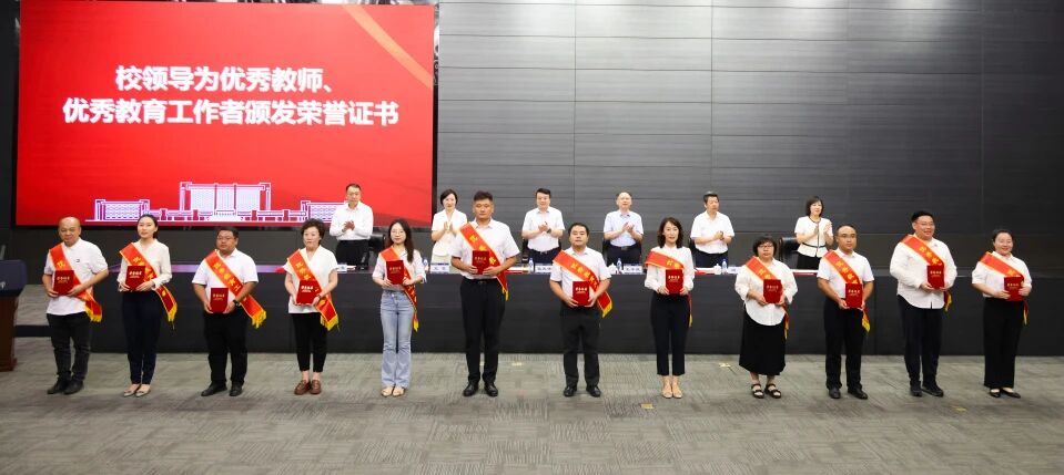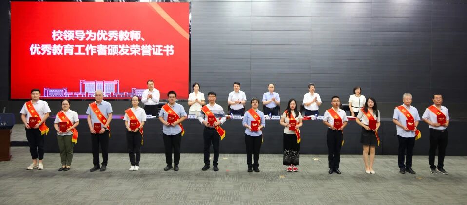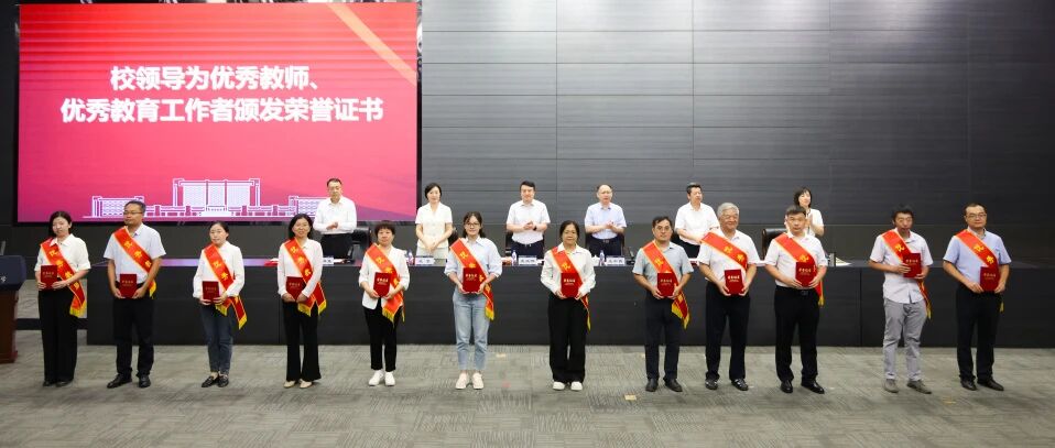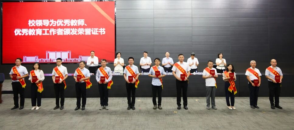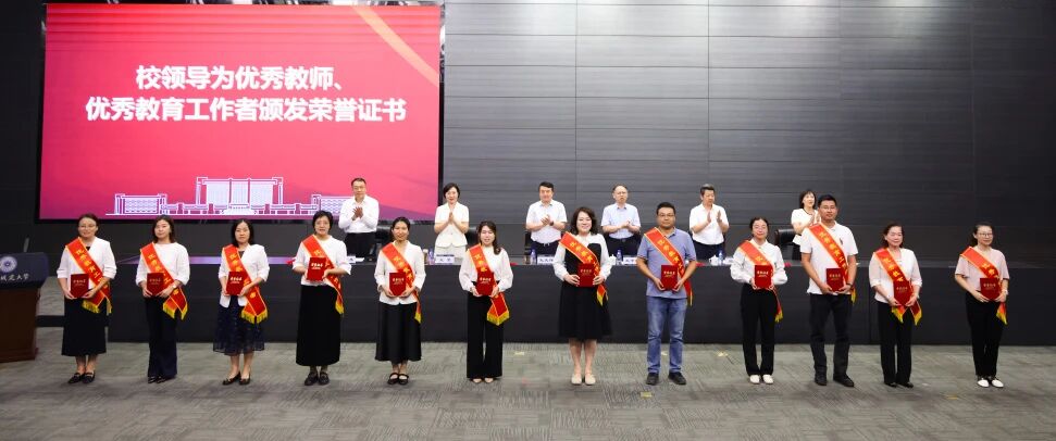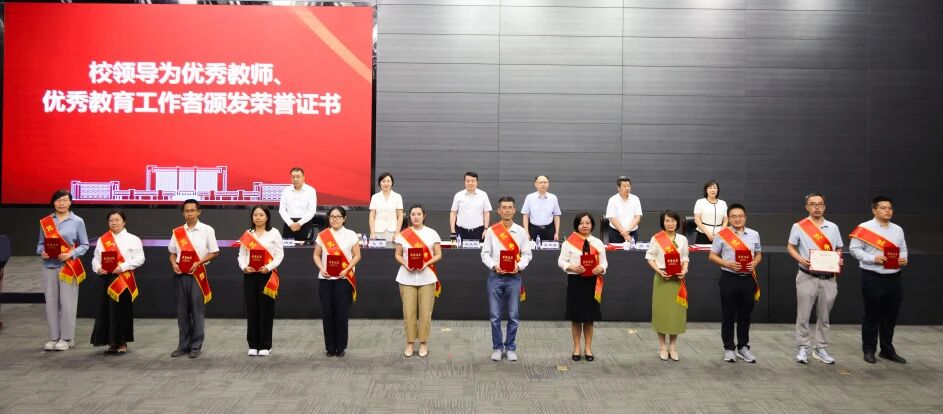 致敬师者担当,礼赞育人初心。校领导为荣获校级优秀教师和优秀教育工作者称号的80名教师颁发荣誉证书,为国家级人才计划青年项目入选者程星磊、天津市三八红旗手周晓洁等在思想政治、教学科研、指导学生竞赛、社会实践等各项工作中取得突出成绩的教师佩戴大红花,充分肯定他们敬业奉献、持之以恒的坚持与付出。
