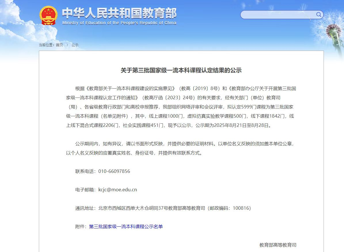 此次获批7门国家级一流本科课程,既是对学校课程建设成果的肯定,也是学校深化教育教学改革的重要契机。下一步,学校将充分发挥一流课程的示范引领作用,持续以课程建设为抓手,融合人工智能等先进技术,优化课程结构、丰富优质课程资源、深化课堂教学模式改革、完善课程质量监控与管理机制,以课程建设高质量发展推动人才培养能力与教育教学质量稳步提升,为培养更多适应新时代建设需求的高素质人才奠定坚实基础。