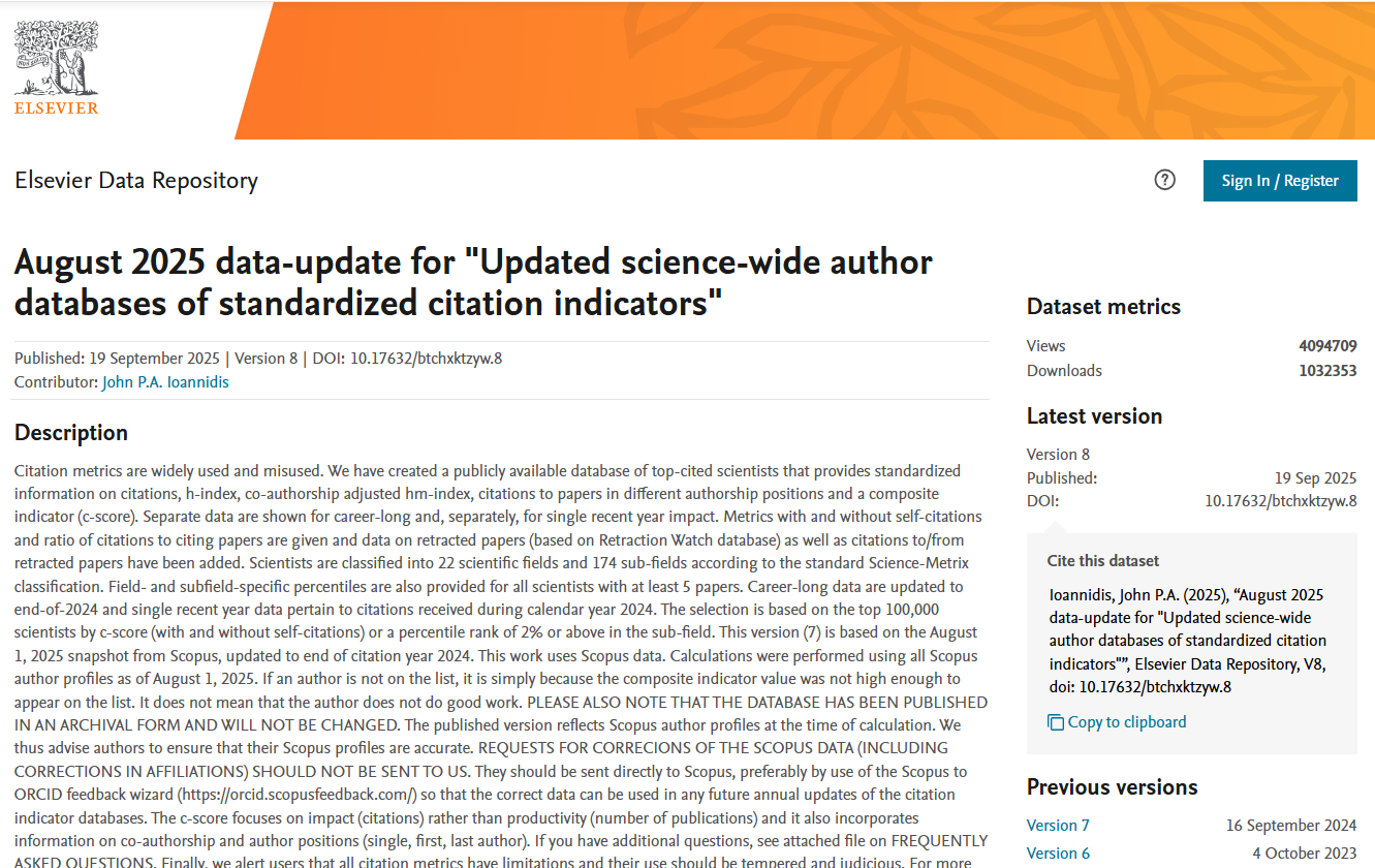 全球前2%顶尖科学家榜单是国际学术界公认的权威评价之一,分为“终身科学影响力排行榜(Career-long Impact)”和“年度科学影响力排行榜(Single-year Impact)”两大部分,从全球近700万名科学家中,通过基于其论文引用数、h因子、合著者修正的hm因子、单独或第一作者的文章引用数等综合参数,遴选出世界排名前2%的科学家,涵盖22个领域和174个子领域。其中,“终身影响力”榜单衡量科学家整个学术生涯期间的累积影响,“年度影响力”榜单则聚焦上一年度的学术表现。