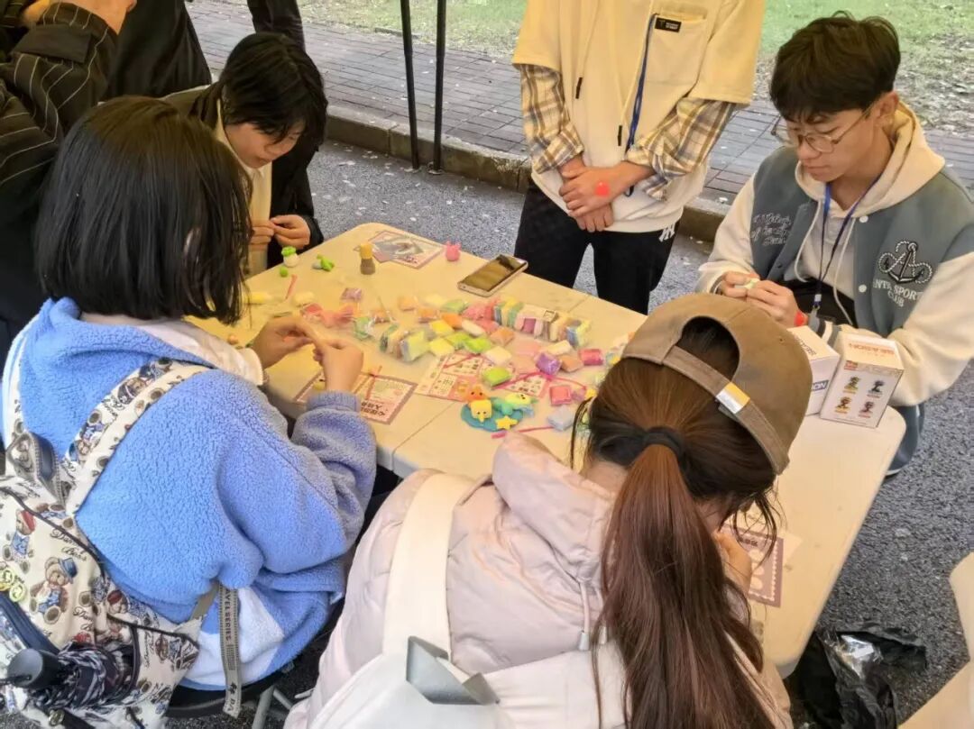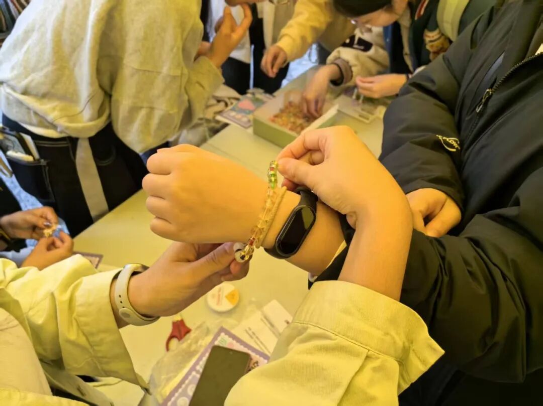 “手作疗愈,知行合一”的“劳心”区域让学生们在动手实践中收获满满。拼个迷你“微景观生态瓶”、尝试用“减压粘土”做小摆件,学编小手链,在一针一线中体验传统手工艺的宁静与耐心。