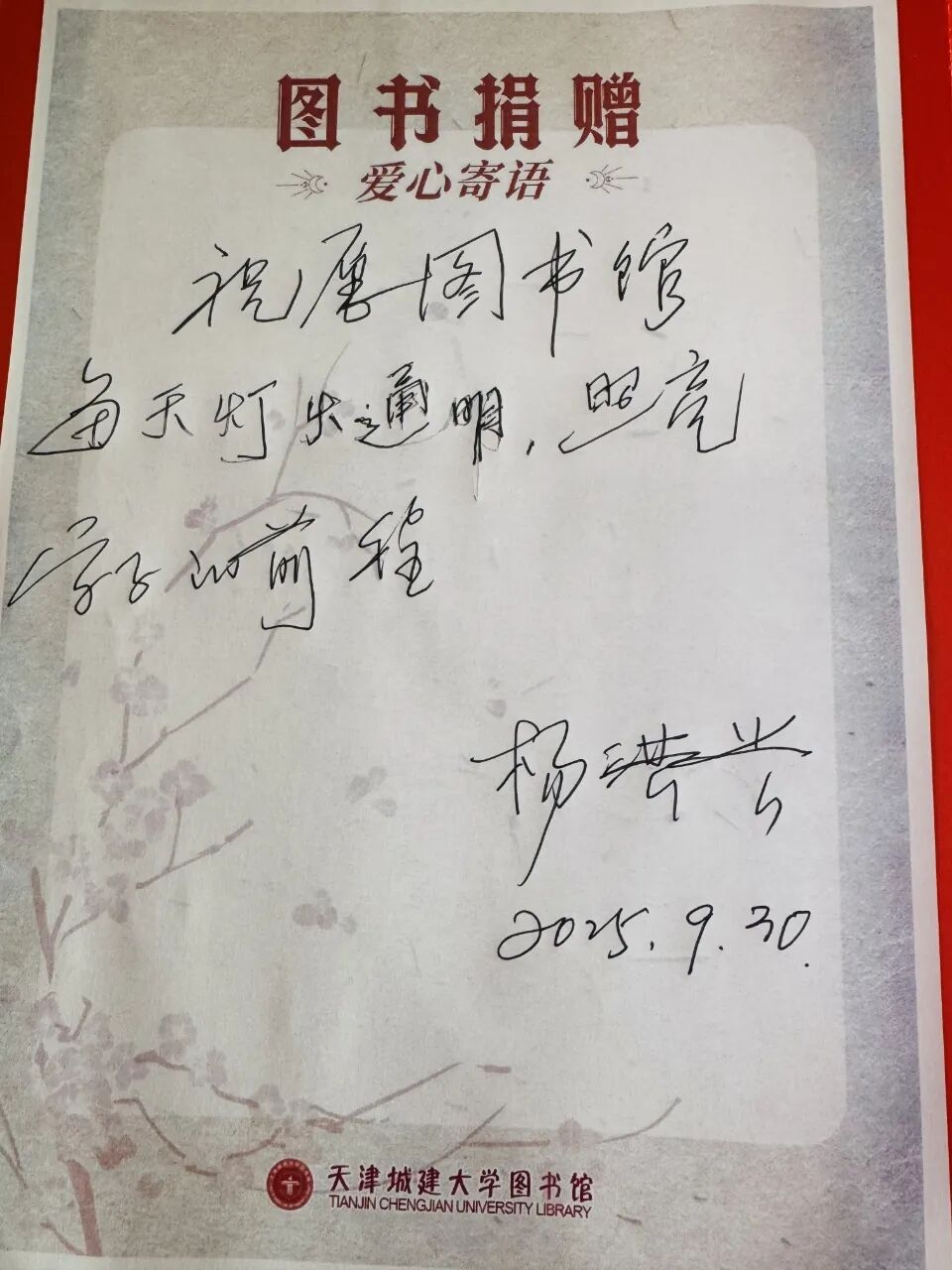 捐赠仪式现场,杨洪兴教授为图书亲笔签名,为图书馆签写捐赠寄语——“祝愿图书馆每天灯火通明,照亮学子前程”。杨教授还结合自身学术经历分享了对知识传播与学术交流的见解。图书馆馆长张文强代表学校接受捐赠。图书馆直属党支部书记刘志军与杨洪兴教授共同为捐赠图书上架,让这批珍贵专著在图书馆“安家落户”。捐赠仪式后,图书馆副馆长柳英重点介绍了图书馆整体资源布局与服务特色,并引导大家一同参观了第三书库、捐赠图书陈展纪念室、半闲书屋。