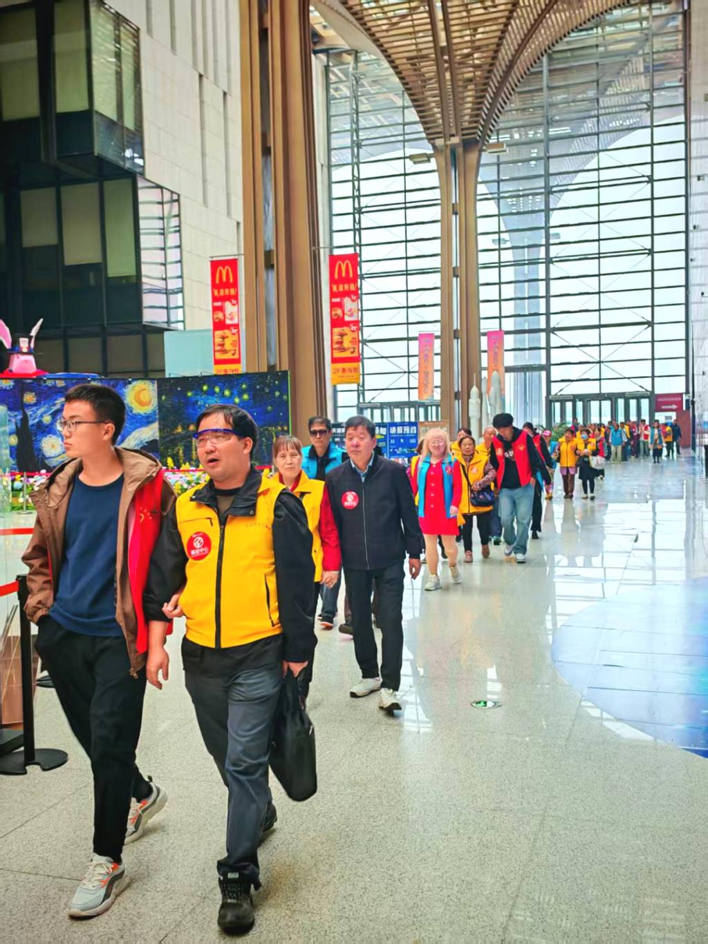 活动当天清晨,365英国志愿者服务队的师生们早早来到各个接站口等候视障朋友们的到来。志愿者们主动迎上前,以温和的语调进行自我介绍,伸出手臂提供支撑。一句“您放心,今天我全程陪您逛科技馆”的暖心承诺,不仅迅速拉近了彼此的距离,也有效缓解了视障朋友初到陌生环境的不安与紧张。