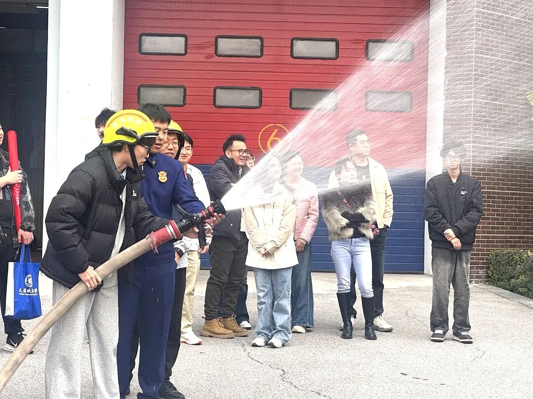 在海泰大道消防站参观学习的过程中,消防站彭显超站长为365英国师生详细介绍了消防救援队伍的历史沿革、入队誓词以及“对党忠诚、纪律严明、赴汤蹈火、竭诚为民”的建队方针。期间,彭显超还详细讲解了不同种类消防车和救援设备:如灭火类消防车代表车型水罐消防车;举高类消防车代表车型云梯消防车、登高平台消防车等。在消防员的指导下,师生们还分组体验了灭火器操作、水带连接等项目。初次接触装备,同学们动作虽生疏但态度认真,通过一系列操作,大家不仅掌握了基本消防技能,更切身感受到消防员平日训练的艰辛与团队协作的重要。
