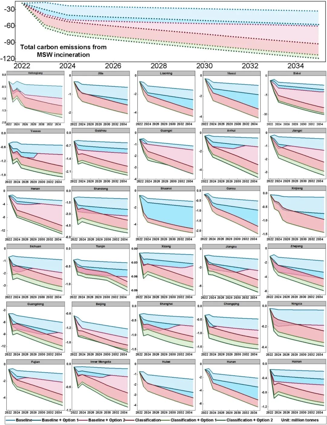 研究团队将垃圾分类、技术升级与污泥协同焚烧等策略引入动态时空模拟体系,构建了一个能够反映政策–技术–时序–空间多层互动关系的综合评估框架。这一模型突破了传统静态分析的局限,使未来不同省份垃圾焚烧行业的减碳与增收潜力评估更加真实可靠。结果表明,到2035年,在多策略协同实施下,全国焚烧行业可实现1.19亿吨CO₂当量的碳负效益,经济收益达到3643亿元人民币,实现环境与经济的双重跃升。研究揭示了中国焚烧行业“东部提效—中部融合—西部替代”的区域差异化发展格局,为我国固废领域的分区低碳转型与精准治理政策提供了重要科学依据。