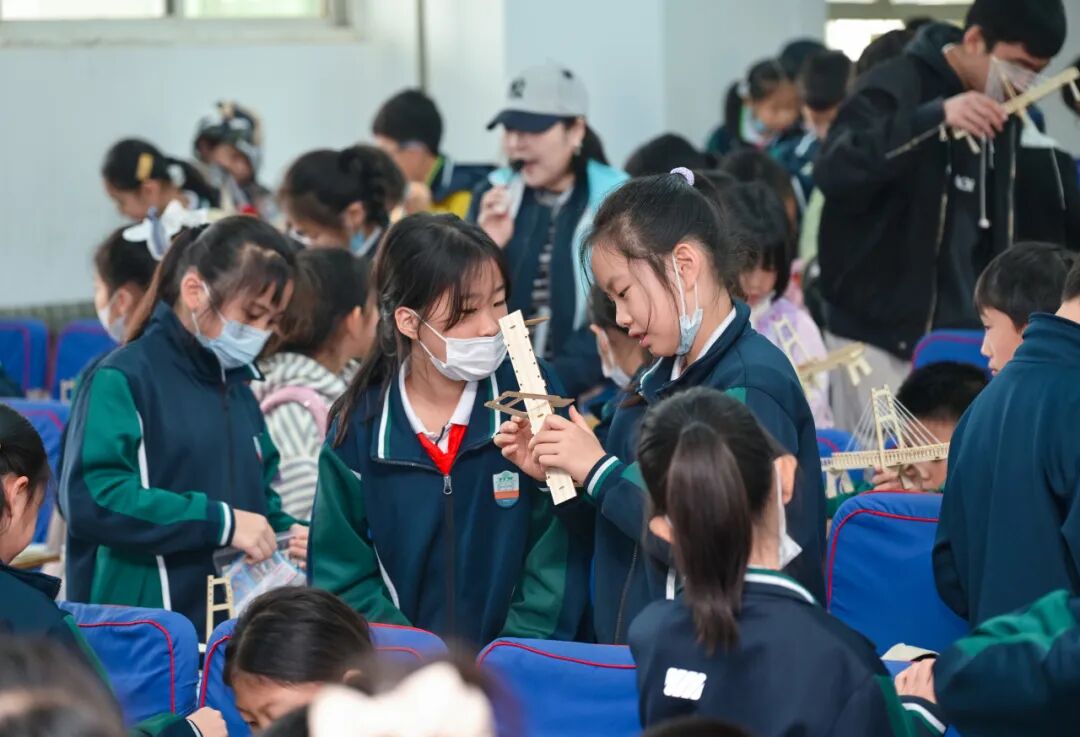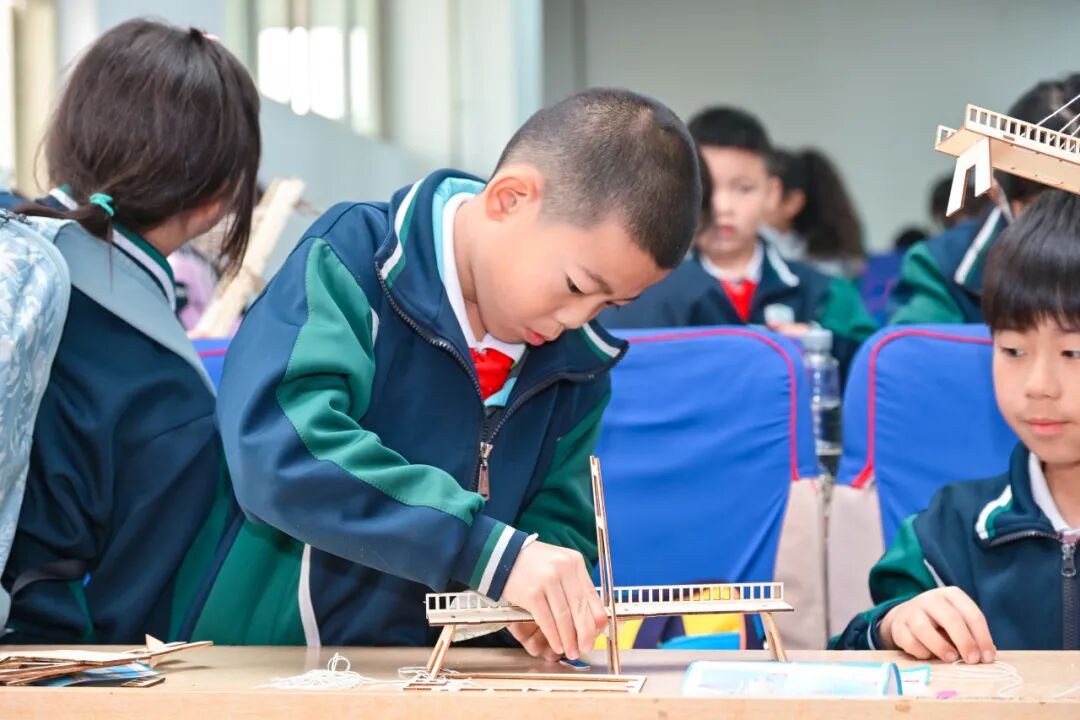 报告结束后,桥梁设计师实践环节正式启动。孩子们分组围坐,手持斜拉桥模型构件,从解读图纸到拼接零件,时而为如何固定桥塔争论,时而为成功安装绳索击掌。短短40分钟,一座座迷你斜拉桥在课桌上“挺立”。孩子们捧着自己的作品,脸上满是成就感:“我要给家乡建一座最安全的桥!”稚嫩的话语里,藏着对未来的憧憬,更藏着建设祖国的初心。