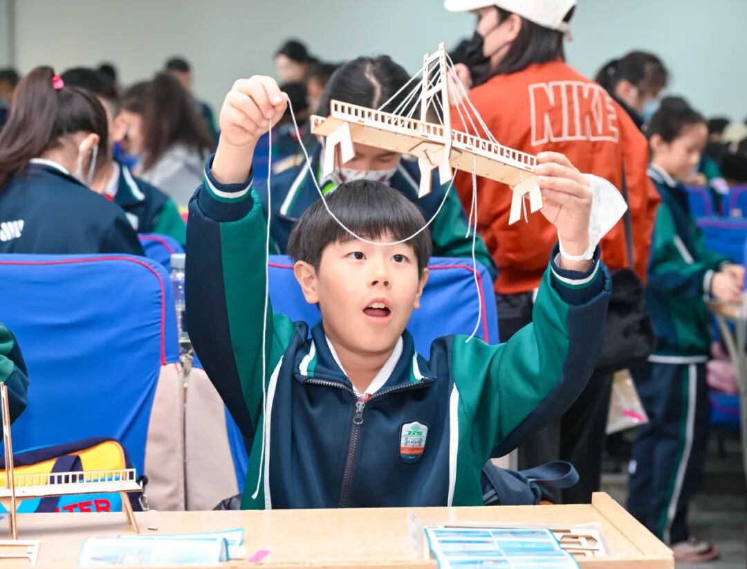 报告中,基地老师以动画演示桥梁力学原理,用故事串联古今:从隋代工匠李春设计赵州桥时的巧思,到现代工程师建造港珠澳大桥时的攻坚克难,一个个案例不仅讲解了桥梁知识,更传递出中国人逢山开路、遇水架桥的奋斗精神。“原来斜拉桥的绳索像‘大力士’,每一根都有自己的作用!”当看到港珠澳大桥的建设视频时,孩子们自发鼓起掌来,眼神里满是自豪。“这就是我们国家的科技实力!”一名学生忍不住和同伴分享。这份家国情怀的萌芽,正是思政教育一体化想要传递的核心力量。
