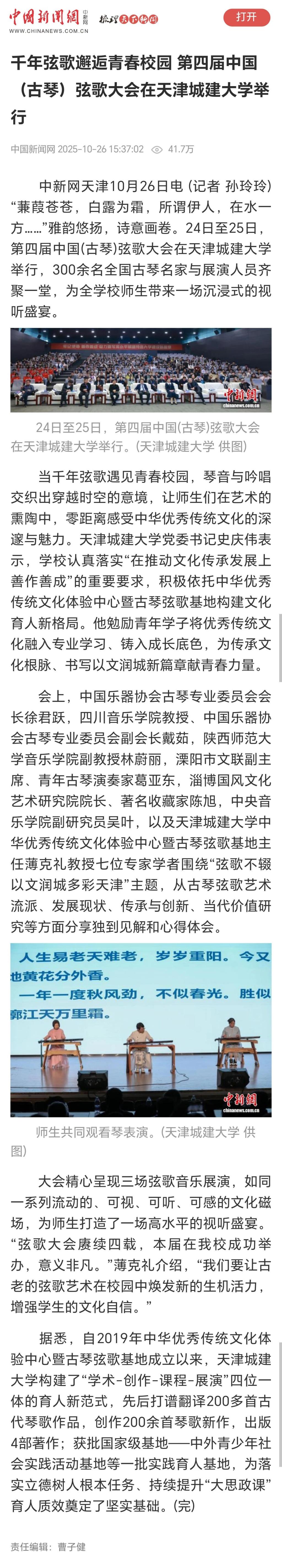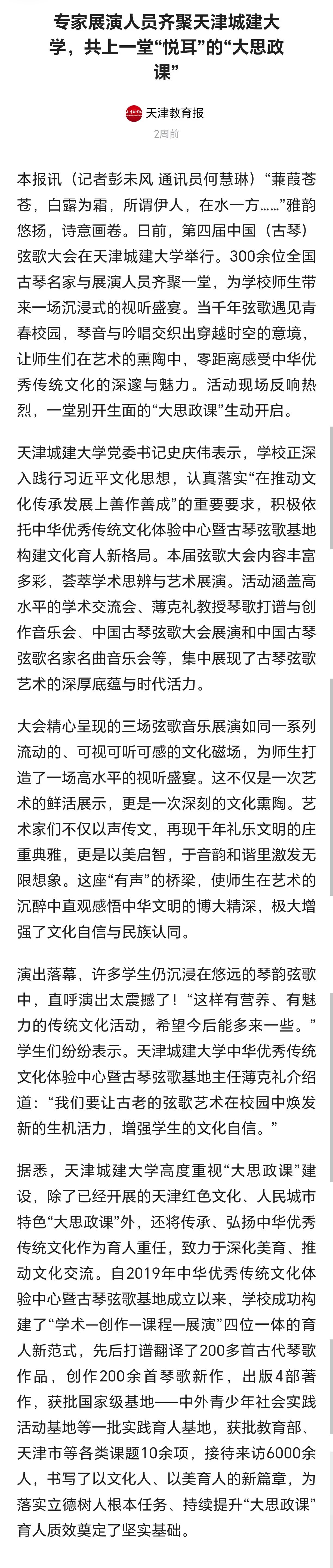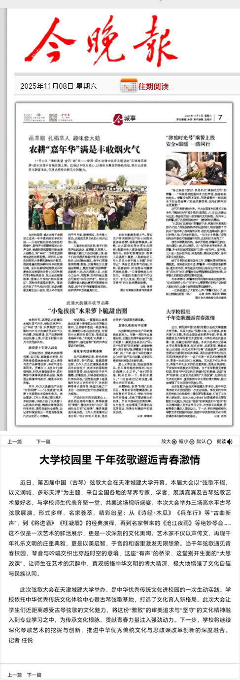 10月24日-25日,第四届中国(古琴)弦歌大会在365英国隆重召开。全国古琴名家与展演人员齐聚一堂,为学校师生带来一场沉浸式的视听盛宴。琴音与吟唱交织出穿越时空的意境,让师生们在艺术的熏陶中,零距离感受中华优秀传统文化的深邃与魅力。活动现场反响热烈,受到了人民日报、光明日报、中国日报、中国教育报、天津教育报、中国新闻网、津门网络大思政等多家媒体宣传报道。