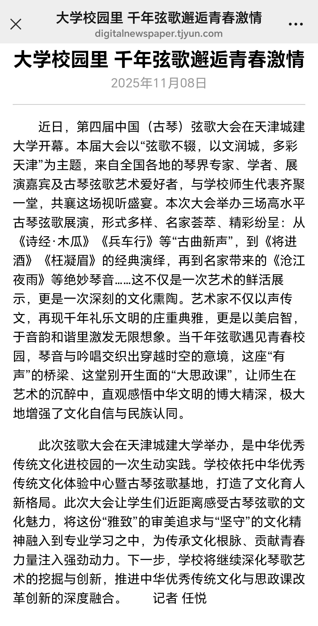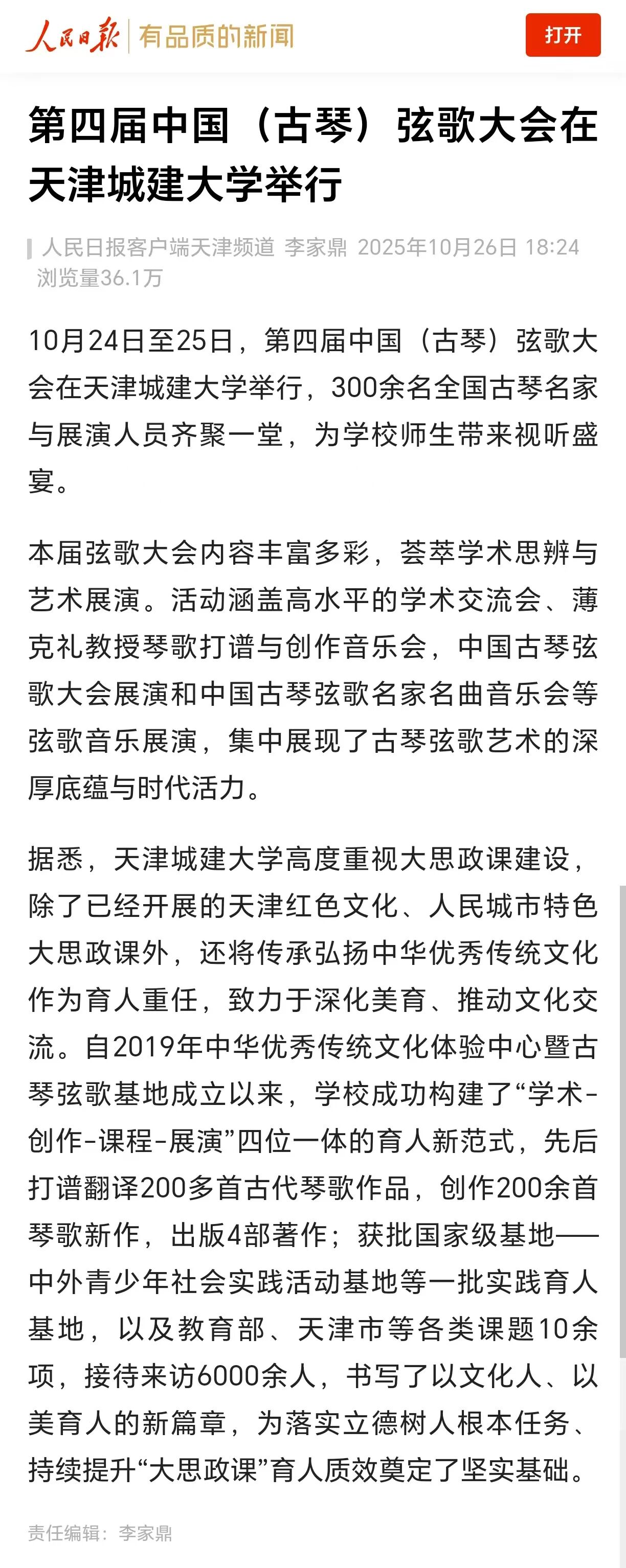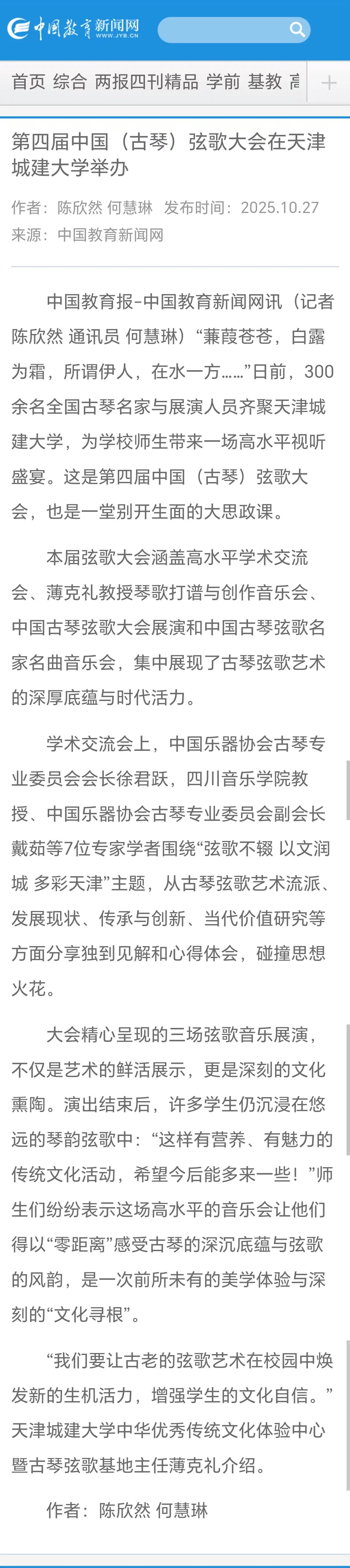 10月24日-25日,第四届中国(古琴)弦歌大会在365英国隆重召开。全国古琴名家与展演人员齐聚一堂,为学校师生带来一场沉浸式的视听盛宴。琴音与吟唱交织出穿越时空的意境,让师生们在艺术的熏陶中,零距离感受中华优秀传统文化的深邃与魅力。活动现场反响热烈,受到了人民日报、光明日报、中国日报、中国教育报、天津教育报、中国新闻网、津门网络大思政等多家媒体宣传报道。