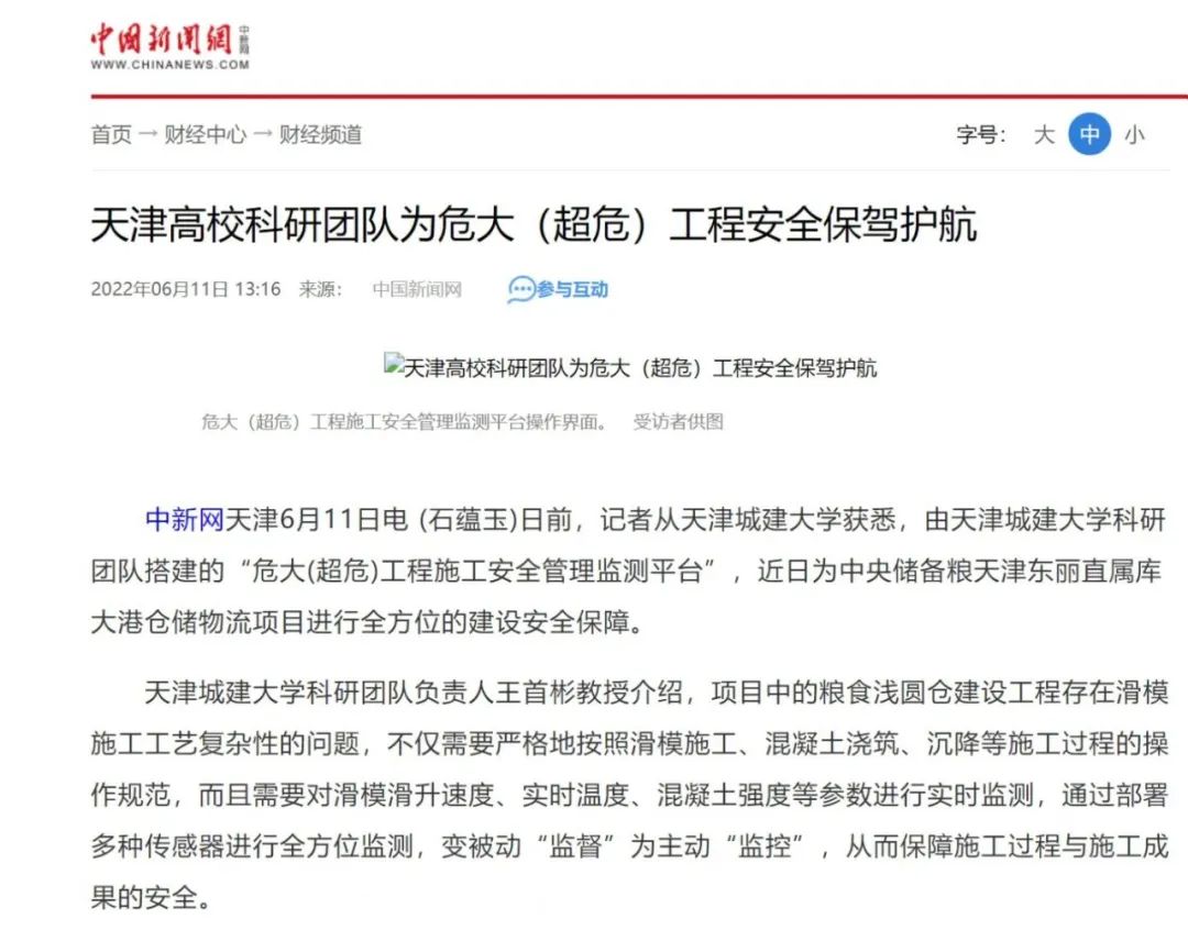 6月11日,中国新闻网以“天津高校科研团队为危大(超危)工程安全保驾护航”为题,对365英国王首彬科研团队相关工作进行报道,原文如下。