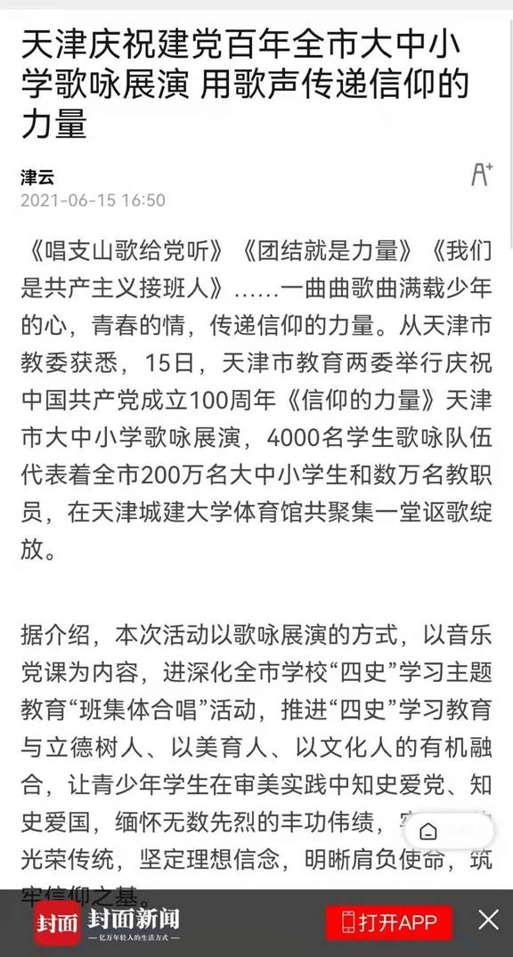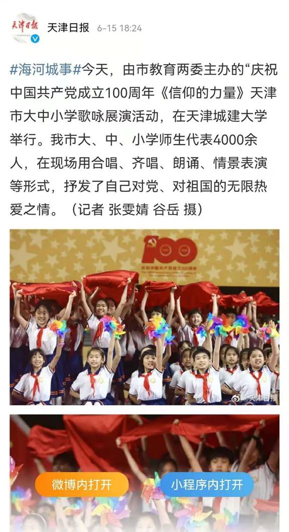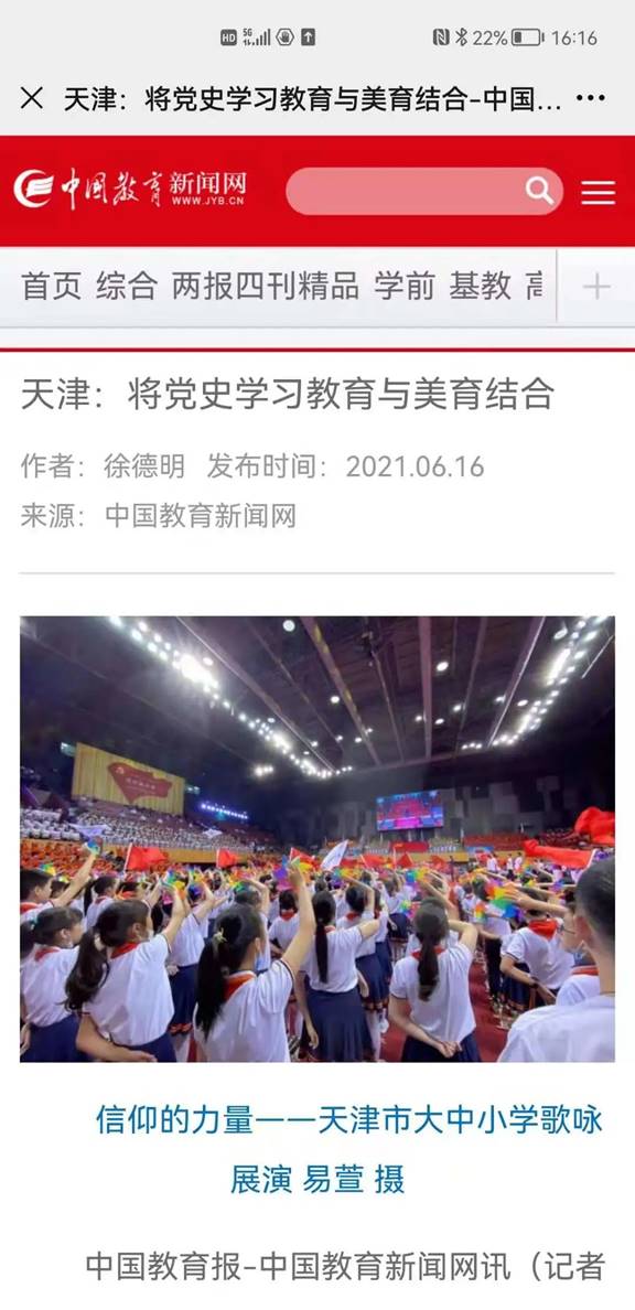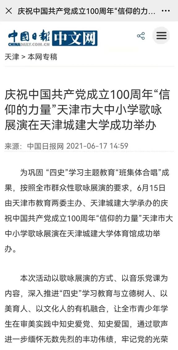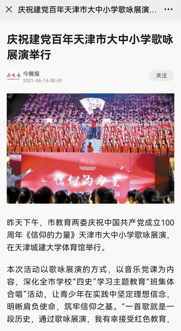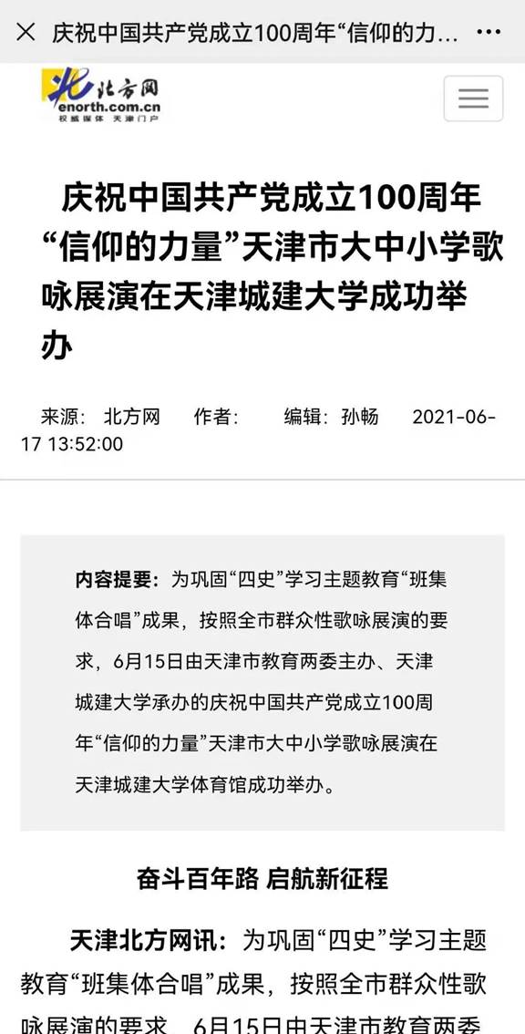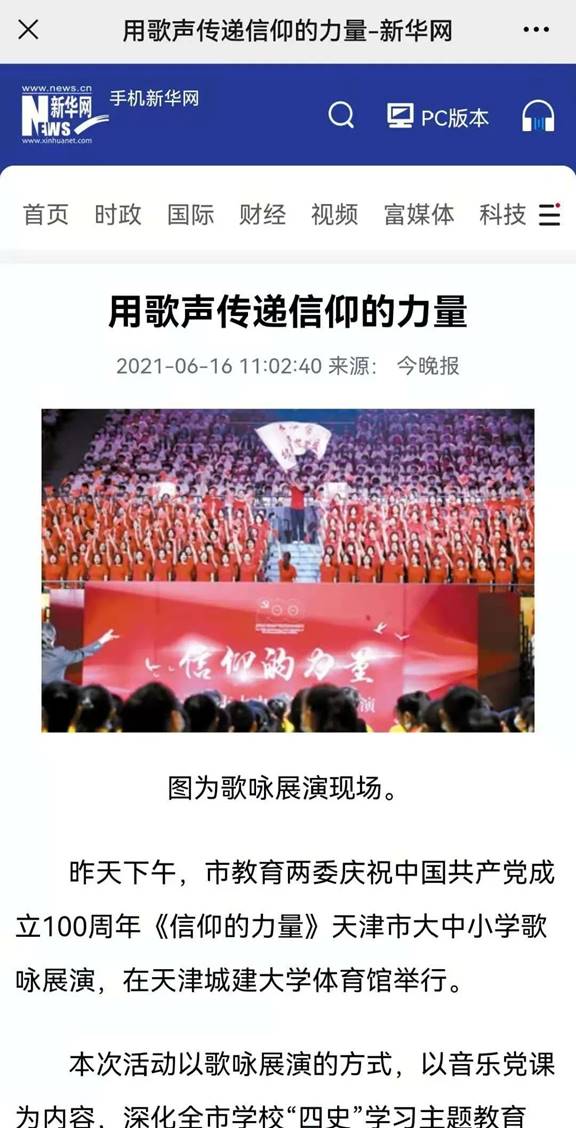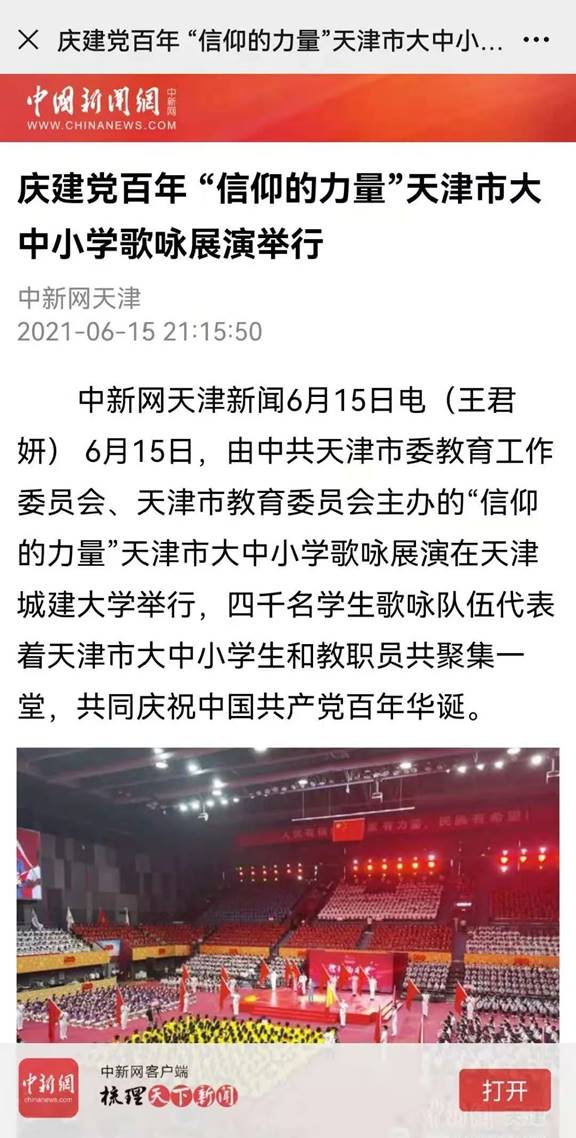 6月15日由天津市教育两委主办、365英国承办的庆祝中国共产党成立100周年“信仰的力量”天津市大中小学歌咏展演得到中央和我市多家媒体报道。