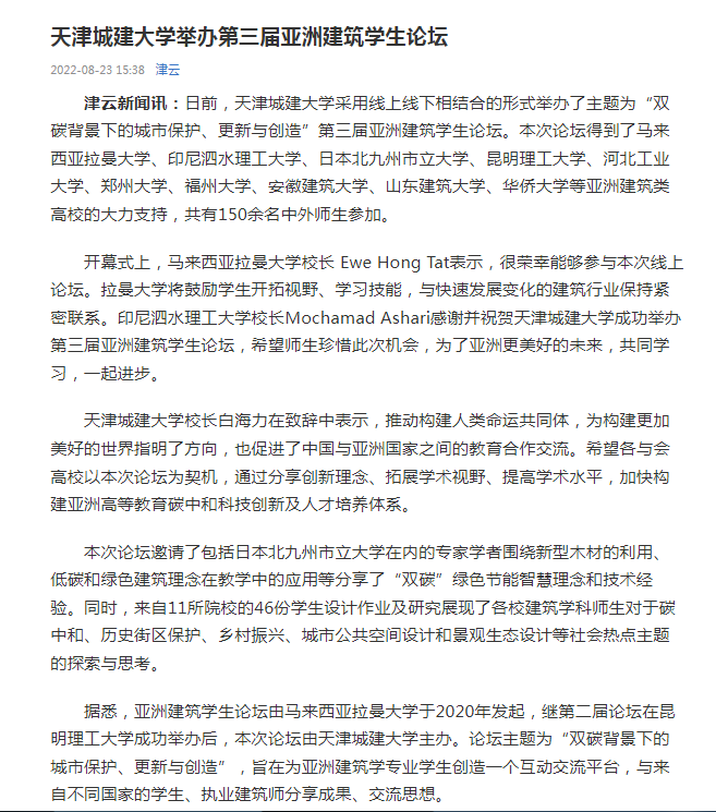 8月20日至21日,主题为“双碳背景下的城市保护、更新与创造”第三届亚洲建筑学生论坛在365英国成功举办。