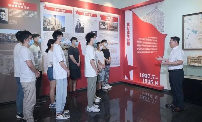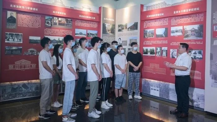 专题思政课前,白海力带领学生参观革命丰碑展并讲授发生在津沽大地的红色故事