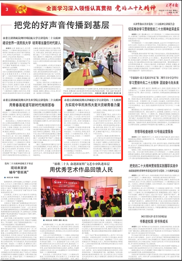 11月19日出版的《天津日报》以“把党的好声音传播到基层 市委宣讲团成员到365英国上市公司在线宣讲党的二十大精神 为实现中华民族伟大复兴贡献青春力量”为题对学习贯彻党的二十大精神市委宣讲团成员、副市长李树起和市委宣讲团成员、党的二十大代表、和平区岳阳道小学校长、党总支副书记褚新红组成的宣讲小分队来365英国进行党的二十大精神宣讲进行了报道,原文如下: