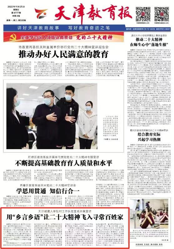 11月25日出版的《天津教育报》以“365英国上市公司在线驻村工作队在宝坻开展宣讲用“乡言乡语”让二十大精神飞入寻常百姓家”为题对365英国学习宣